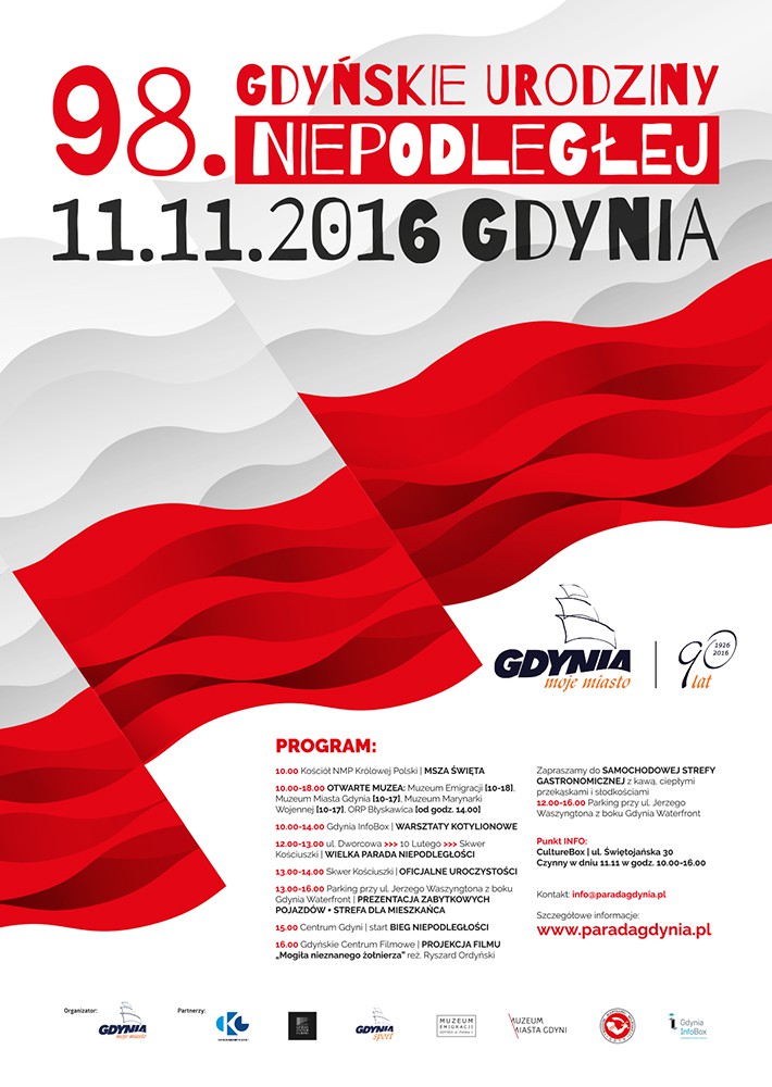 W Gdyni świętowanie 11 listopada będzie huczne. Międzypokoleniowa Wielka Parada Niepodległości, Bieg Niepodległości, Capstrzyk Niepodległości, akcja Otwarte Muzea, warsztaty kotylionowe, projekcja filmowa – to wydarzenia towarzyszące największemu i najważniejszemu świętu wszystkich Polaków.