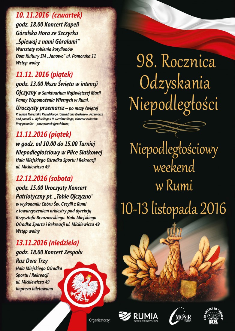 Do czwartku mieszkańcy Rumi mogą odbierać biało-czerwone flagi w urzędzie miasta. Odbywa się także konkurs na zdjęcie patriotyczne, odbędzie się uroczysta msza oraz koncert.