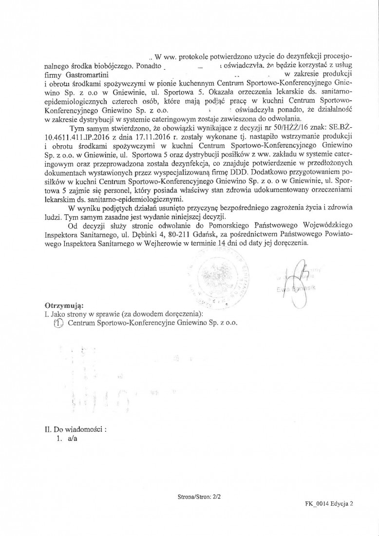Decyzja Państwowego Powiatowego Inspektora Sanitarnego - dokumenty przesłane przez Centrum Sportowo-Konferencyjne w Gniewinie