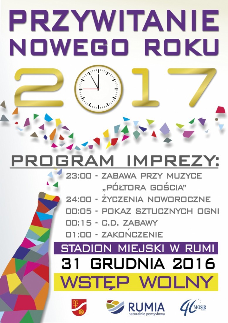 Burmistrz Rumi zaprasza wszystkich na miejskiego sylwestra 2016. Wydarzenie rozpocznie się o godzinie 23:00 na stadionie MOSiR - Więcej szczegółów.