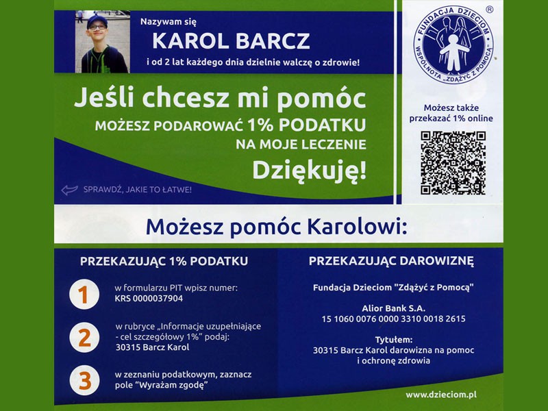 Karolowi można pomóc przekazując 1 procent podatku lub darowiznę. Szczegóły znajdują się na plakacie.