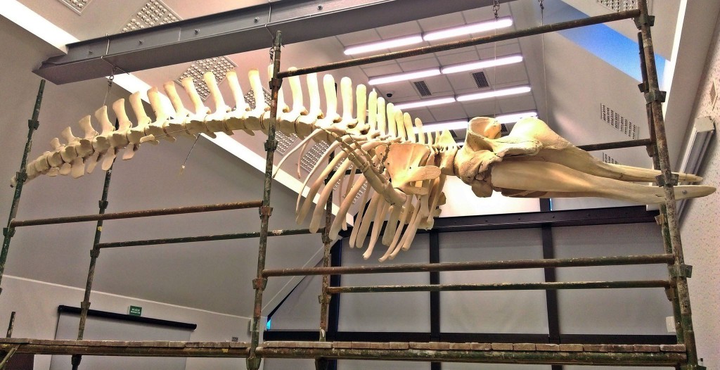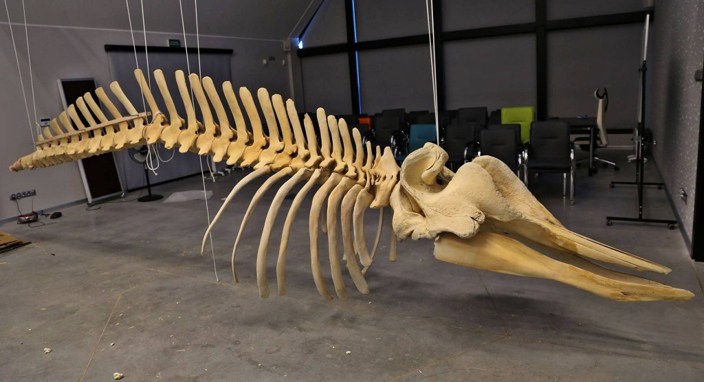 Ważący nieco ponad 120 kilogramów, mierzący 7 metrów i składający się ze 128 elementów układu kostnego szkielet wala butlonosego zawisł w Stacji Morskiej w Helu.