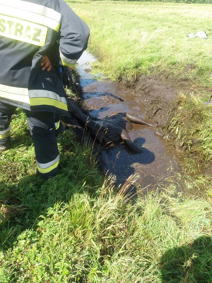 Chciał się napić wody, a wpadł do rowu i utknął. Wycieńczonego, młodego konia uratowali od śmierci strażacy-ochotnicy.