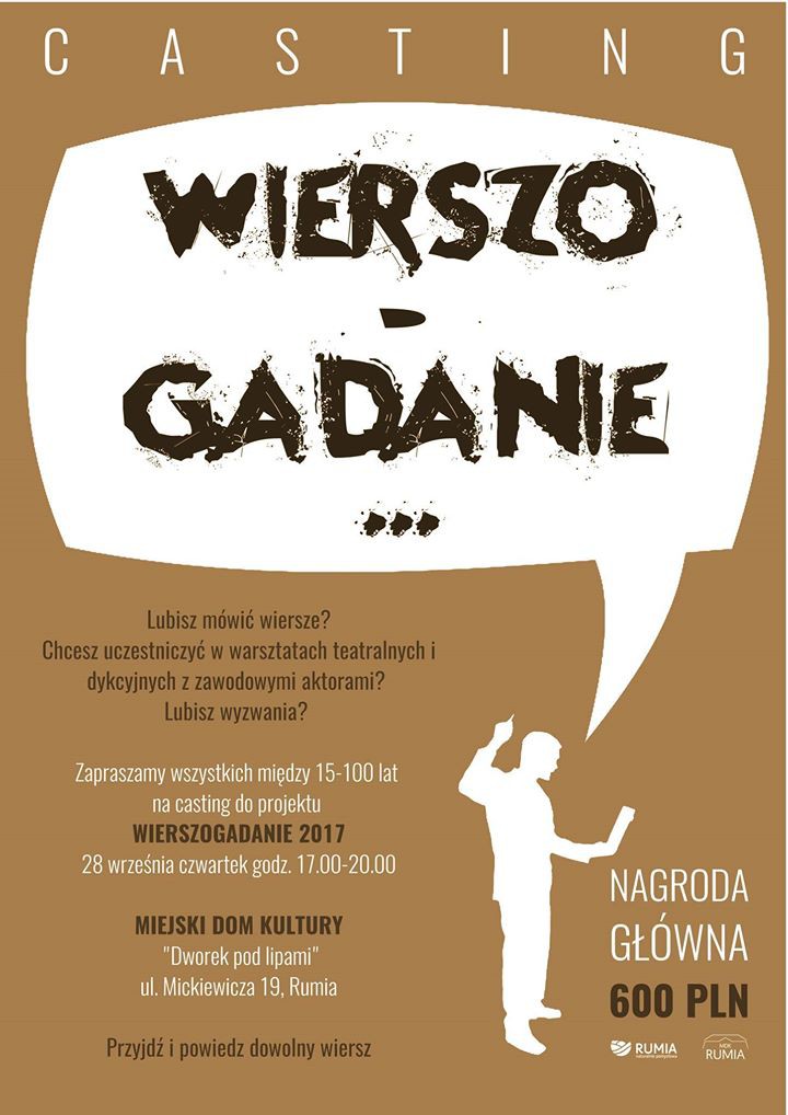 Miejski Dom Kultury w Rumi zaprasza wszystkich między piętnastym a setnym rokiem życia do udziału w nowym projekcie o nazwie „Wierszogadanie”. Dzięki inicjatywie uczestnicy nie tylko wzbogacą swoje słownictwo i poprawią dykcję, ale będą mogli również znaleźć nową drogę w życiu.