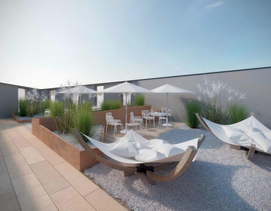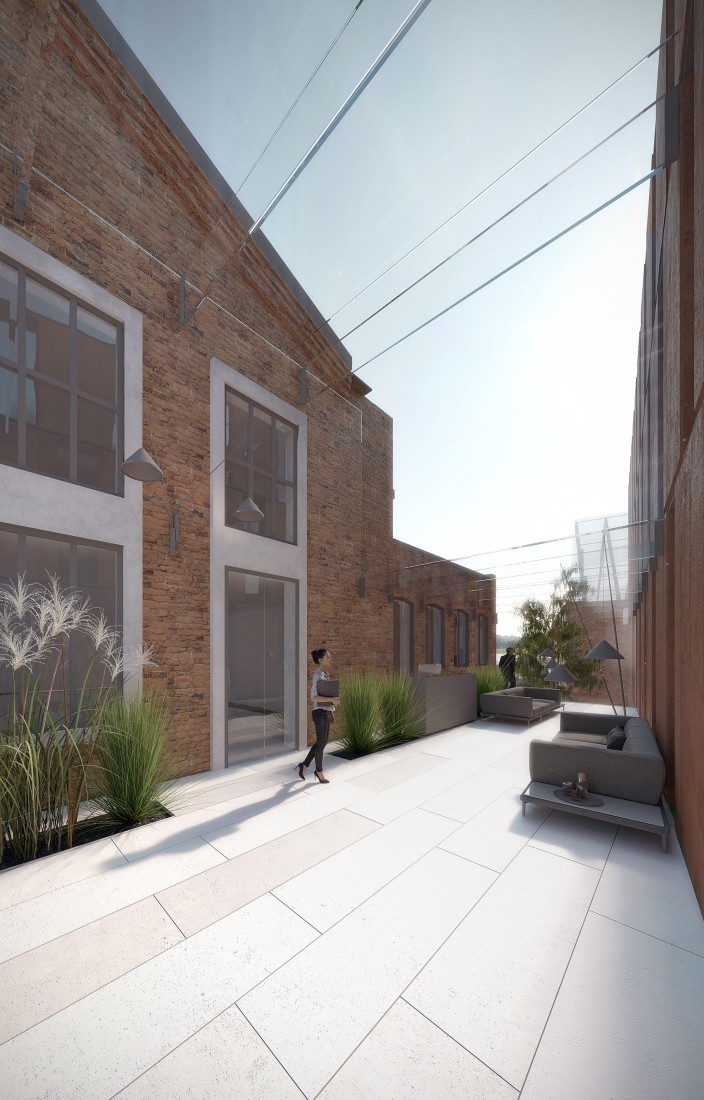 Przestrzeń, która wytworzyła się między nowym budynkiem biurowym a istniejącym już oraz planowanym połączeniem kanałów Motławy kładką dla pieszych, stanowi dopełnienie całości projektu. W założeniu mają z niej korzystać zarówno pracownicy GIWK, klienci tej firmy, jak i turyści i mieszkańcy Gdańska. Projektowany ciąg pieszy ma mieć charakter ogólnodostępnego bulwaru.