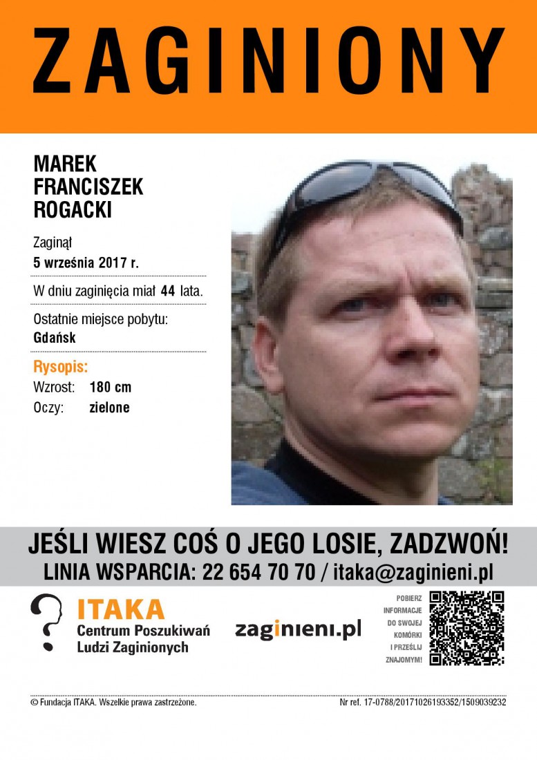 Centrum Poszukiwań Ludzi Zaginionych - Fundacja ITAKA, na prośbę rodziny i we współpracy z policją, prowadzi poszukiwania 44-letniego Marka Franciszka Rogackiego. Mężczyzna zaginął 5 września 2017 roku w Gdańsku.