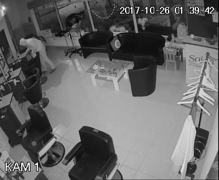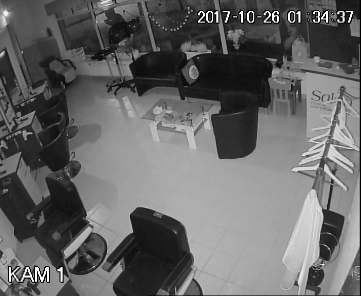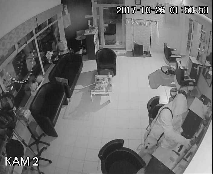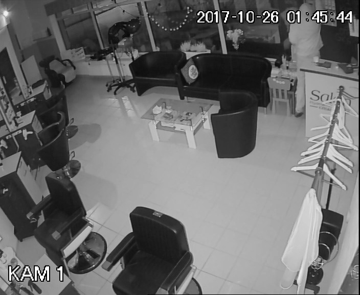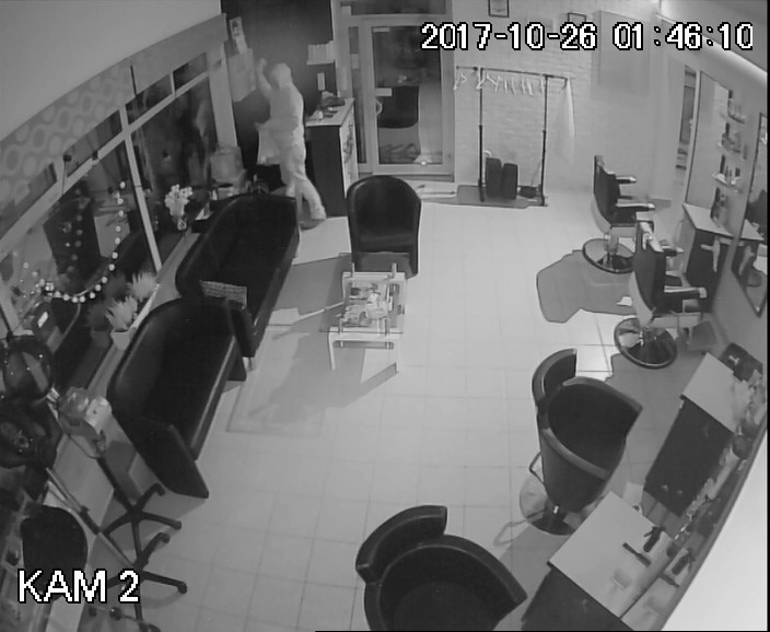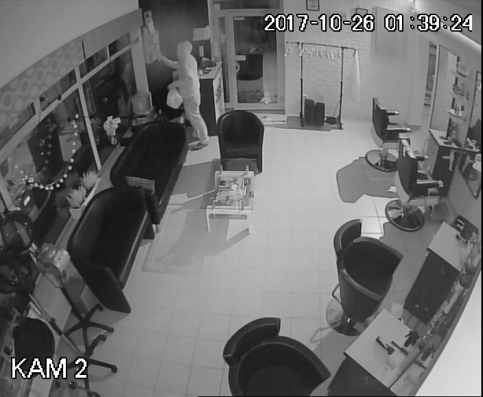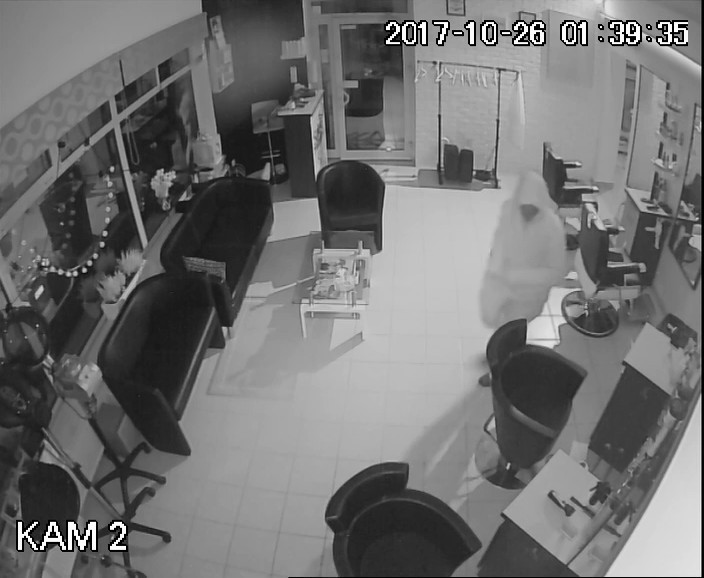 – Do włamania doszło w nocy ze środy na czwartek (25/26 października), o czym dowiedzieliśmy się rano, gdy przyszliśmy do pracy – relacjonuje Marek Czylkowski, właściciel salonu. – Zegar w monitoringu spóźnia się o godzinę, dlatego wbrew temu, co widać na zdjęciach, o godzinie 2:20 zaczęły się pierwsze przejścia pod oknem i świecenie latarką. Natomiast o godzinie 3:00 wszystko się zakończyło, złodziej wyszedł z salonu – dodaje.