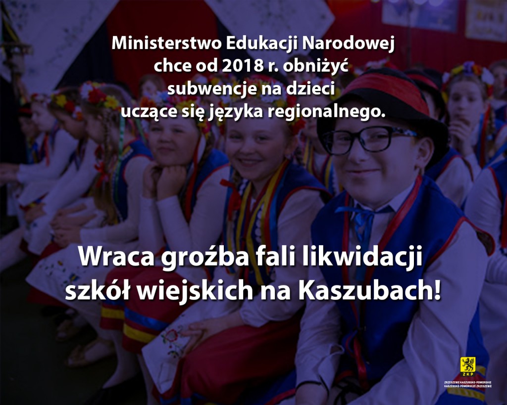 „Ministerstwo Edukacji Narodowej chce od 2018 roku obniżyć subwencje na dzieci uczące się języka kaszubskiego. Wraca groźba fali likwidacji szkół wiejskich na Kaszubach!" - zdjęcie z takim podpisem, sygnowane logiem Zrzeszenia Kaszubsko-Pomorskiego, pojawiło się w sieci.