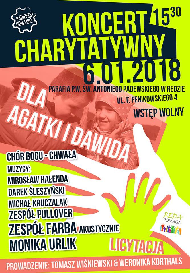 W Redzie w parafii p.w. św. Antoniego Padewskiego o godzinie 15:30 odbędzie się uroczysty koncert świąteczno-charytatywny. Koncert poprowadzą Tomasz Wiśniewski i Weronika Korthals. Na scenie zobaczymy chór Bogu – Chwała, zespół Pullover, zespół Farba i Monikę Urlik (finalistkę programu Voice of Poland).