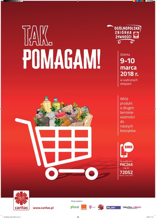 W dniach 9 i 10 marca 2018 roku Caritas Polska organizuje ogólnopolską zbiórkę żywności pod hasłem „Tak, pomagam”.