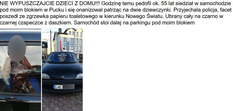 O zdarzeniu zaalarmowała mieszkańców Pucka jedna z użytkowniczek Facebooka. Mężczyzna, który siedział w zaparkowanym fiacie seicento, miał się zachowywać nieprzyzwoicie w stosunku do dwóch dziewczynek.