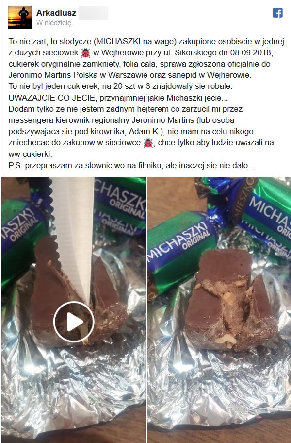 W niedzielę (9 września) w nocy na portalu społecznościowym mieszkaniec Wejherowa opublikował film, na którym z czekoladowego cukierka wypełza biała larwa. Jak twierdzi, produkt kupił w sobotę, a cukierek był oryginalnie zamknięty w folii.