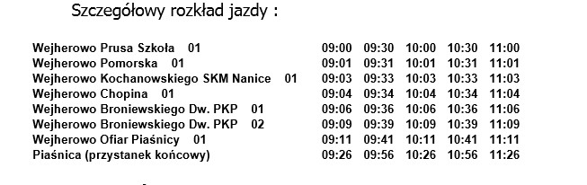 Dodatkowy autobus kursować będzie na trasie: Osiedle Kaszubskie - Prusa - Pomorska - Kochanowskiego - I Brygady Panc. WP - Ofiar Piaśnicy - Piaśnica. Przystanek początkowy będzie miał swoje miejsce przy szkole nr 11 na ulicy Prusa. Odjazdy w kierunku Piaśnicy planowane są na godziny: 09:00, 09:30, 10:00, 10:30 i 11:00