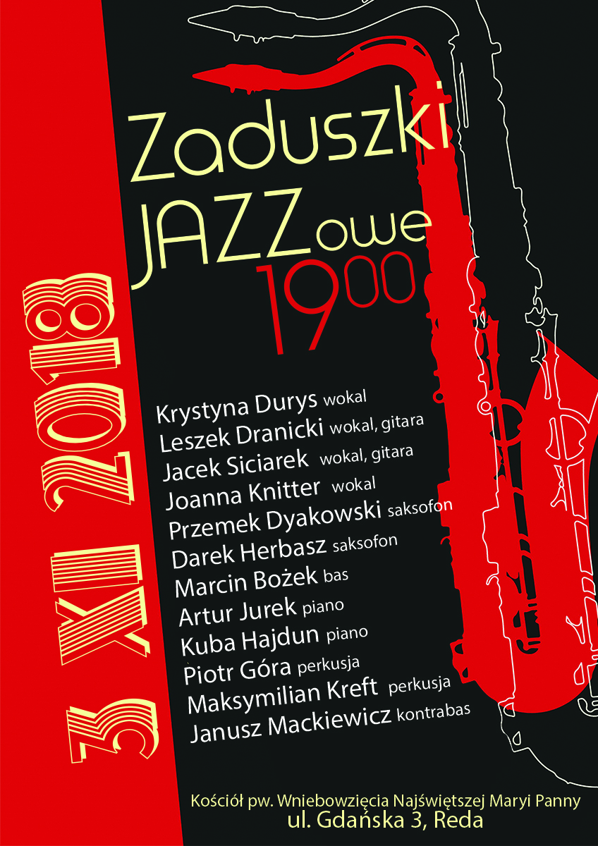 W sobotę 3 listopada o godzinie 19:00 w kościele pw. WNMP. i Św. Katarzyny w Redzie odbędą się Zaduszki Jazzowe, organizowane przez Fabrykę Kultury. Wstęp na wydarzenie jest wolny. To piękny zwyczaj kultywowany przez polskich muzyków jazzowych, mający swój początek w pierwszej połowie lat 50. ubiegłego wieku. Wówczas jazz, jako muzyka wroga ideologicznie (okres socrealizmu w sztuce), był zakazany. Muzycy zbierali się w prywatnych mieszkaniach i grali dla wtajemniczonych słuchaczy. W okresie Zaduszek takie spotkania miały miejsce w Krakowie, gdzie zjeżdżali muzycy tworzący historię polskiego jazzu, m.in. Jerzy Duduś Matuszkiewicz, Krzysztof Komeda Trzciński, Andrzej Kurylewicz, Andrzej Trzaskowski, Jan Ptaszyn Wróblewski, Witold Sobociński, Witek Kujawski i inni. Na fali odwilży popaździernikowej jazz wyszedł z okresu katakumbowego i odtąd Zaduszki Jazzowe odbywają się corocznie oraz są poświęcone pamięci zmarłych muzyków.