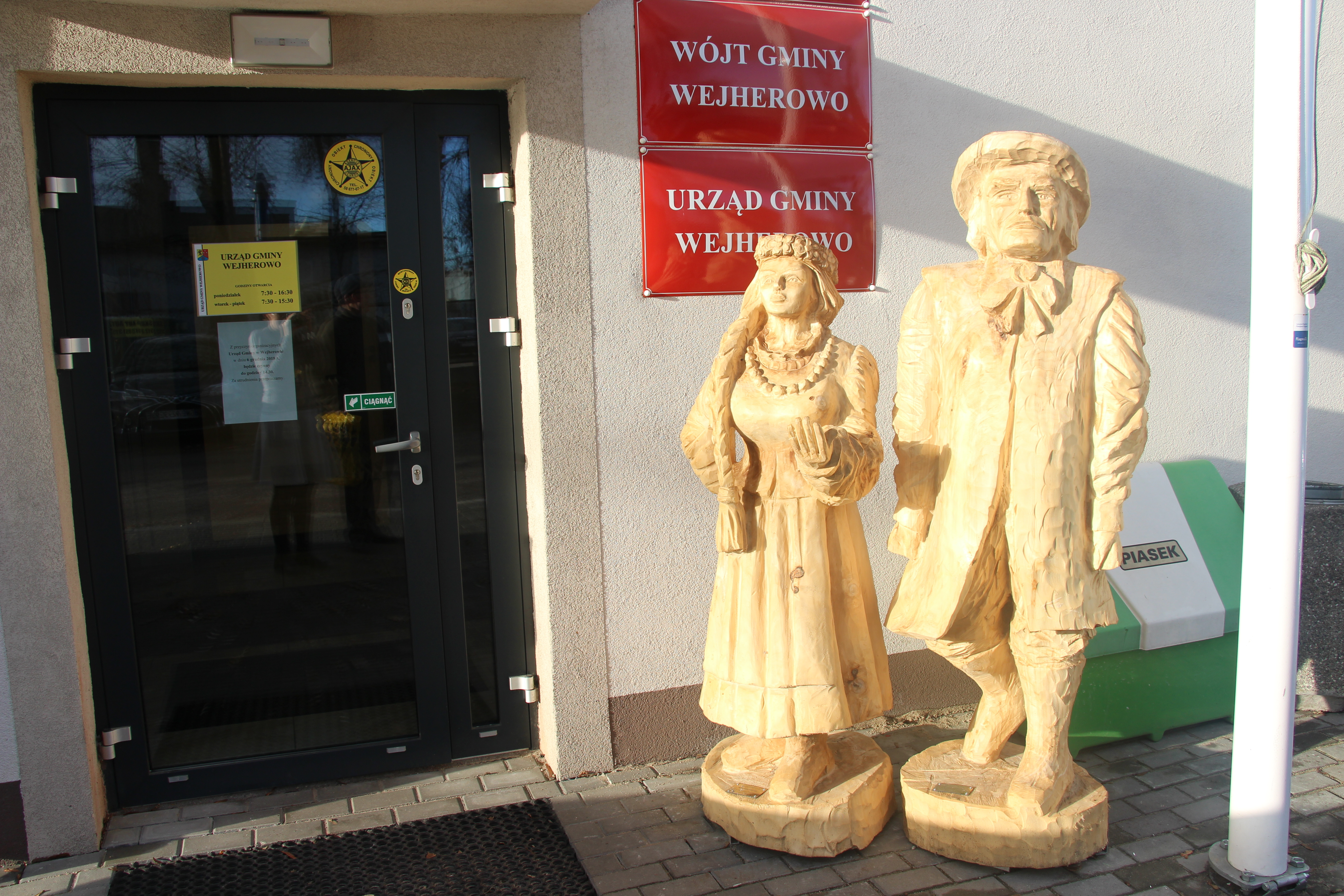 – Korytarze budynku Urzędu Gminy Wejherowo wzbogaciły się o rzeźbione w drewnie ławeczki. Natomiast przed wejściem do budynku interesantów wita wyrzeźbiona para Kaszubów – czytamy na stronie Urzędu Gminy Wejherowo.