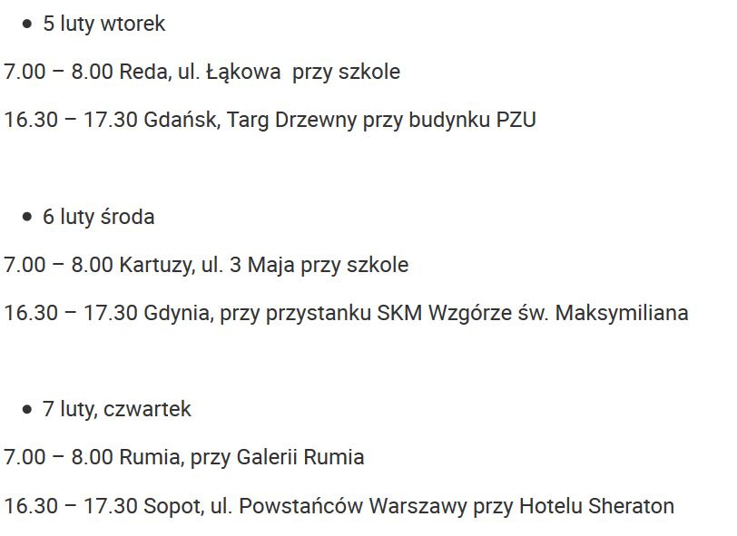Akcja potrwa trzy dni i obejmie sześć miast: Gdańsk, Sopot, Gdynię, Rumię, Redę oraz Kartuzy. Odblaski będą rozdawane rano i wieczorem przy wybranych przejściach dla pieszych. I tak, już jutro (5 lutego) będzie można je otrzymać w godzinach 7:00–8:00 przy szkole w Redzie (ul. Łąkowa), natomiast w czwartek (7 lutego), w tych samych godzinach, w Rumi, przy tamtejszej galerii handlowej (ul. Sobieskiego).