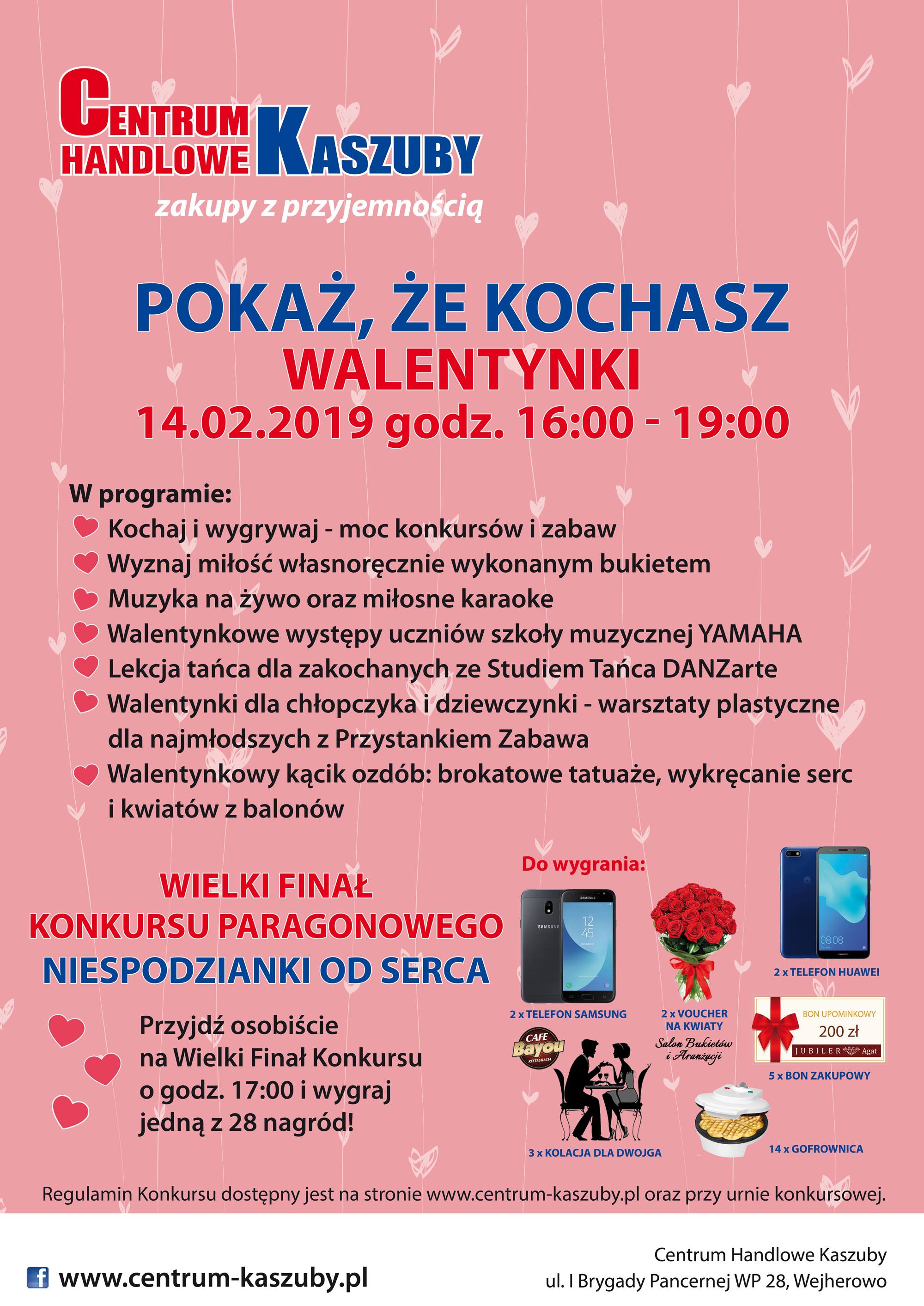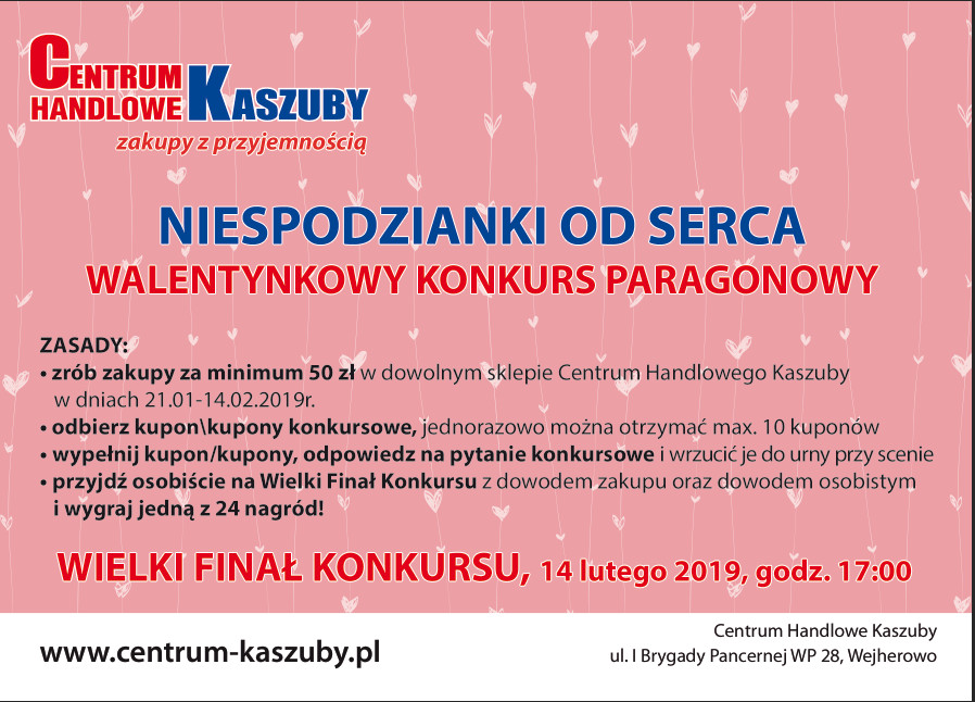 Z okazji Walentynek Centrum Handlowe Kaszuby w Wejherowie przygotowało konkurs paragonowy, w którym można wygrać między innymi smartfony, bony zakupowe czy kolacje dla dwojga. Oprócz tego 14 lutego na odwiedzających ten obiekt będzie czekać moc atrakcji.