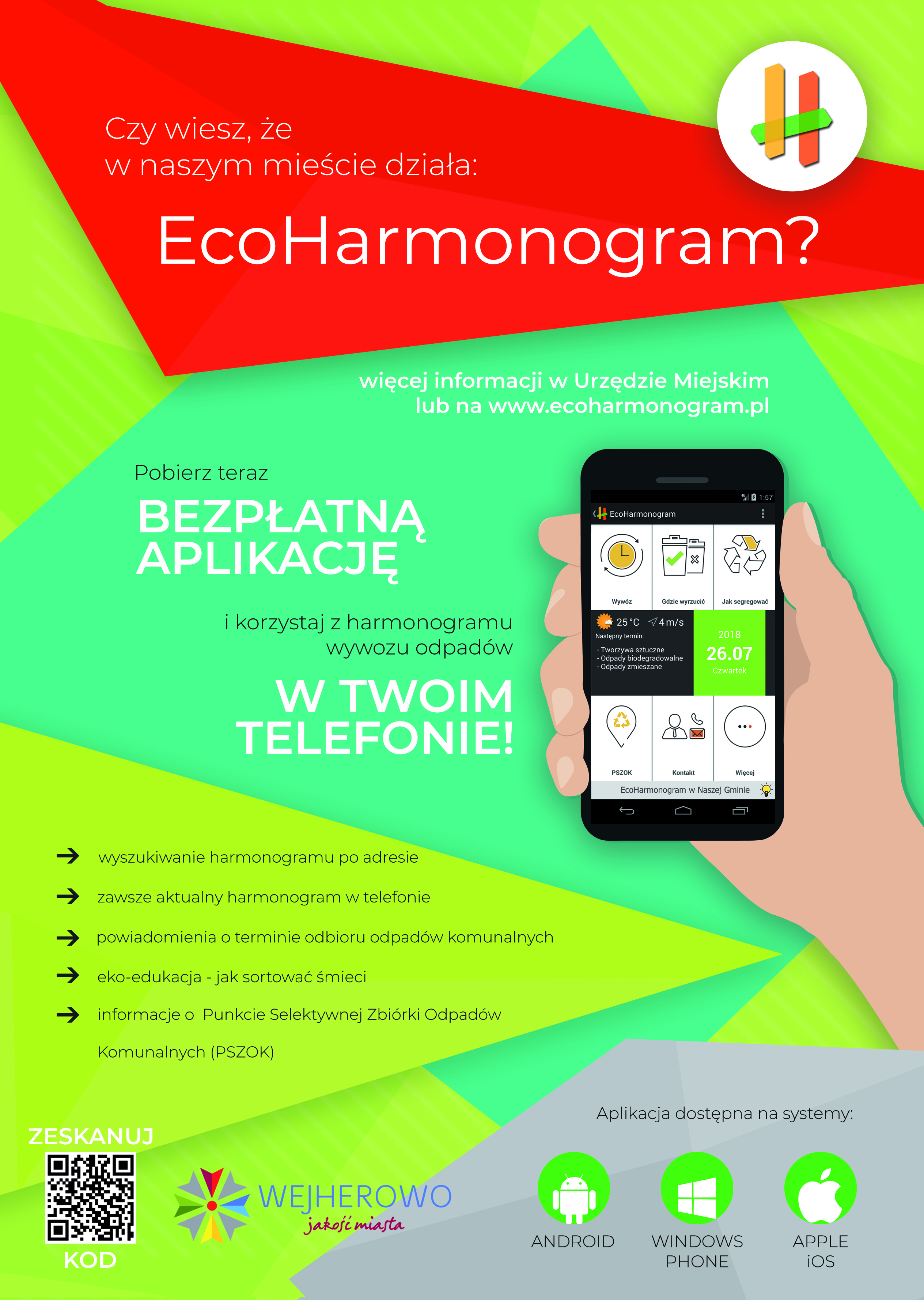 – EcoHarmonogram to darmowa aplikacja, której najważniejszym zadaniem jest przypominanie mieszkańcom o terminie wywózki śmieci. Zawiera informację o Punkcie Selektywnej Zbiórki Odpadów (PSZOK), do którego należy wywozić kłopotliwe takie odpady, jak metal, złom, chemikalia, zużyte baterie i akumulatory, zużyty sprzęt elektryczny i elektroniczny, meble, odpady budowlane i rozbiórkowe, zużyte opony samochodowe itp. Ponadto w aplikacji można sprawdzić, jak sortować odpady. W aplikacji EcoHarmonogram dowiemy się też, jakie pojemniki znajdują się w naszej gminie i co powinniśmy do nich wrzucać – informuje wejherowski urząd miasta.