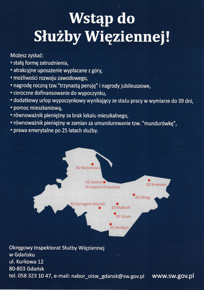 Szczegółowe informacje dotyczące postępowania kwalifikacyjnego można uzyskać pod adresem Okręgowego Inspektoratu Służby Więziennej w Gdańsku (ul. Kurkowa 12, 80–803 Gdańsk) i pod numerem telefonu 58 323 10 47 oraz adresem e-mail: [email protected].