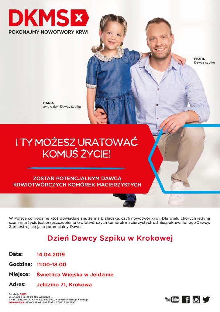Wszyscy mieszkańcy gminy Krokowa – i nie tylko – już w najbliższą niedzielę będą mogli zarejestrować się jako potencjalni dawcy szpiku w bazie fundacji DKMS. Taki jest cel akcji pod hasłem #dajszpik. Odbędzie się ona w świetlicy wiejskiej w Jeldzinie, w godzinach 11:00–18:00.