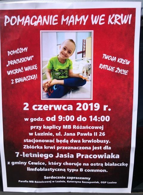 W niedzielę (2 czerwca) w Luzinie stacjonują dwa krwiobusy, których zadaniem jest zbiórka krwi dla chłopca. Jaś Pracowiak jest mieszkańcem gminy Cewice i pogodnym siedmiolatkiem z zespołem Downa. Młody wojownik toczy zaciekłą walkę z białaczką limfoblastyczną typu B common.