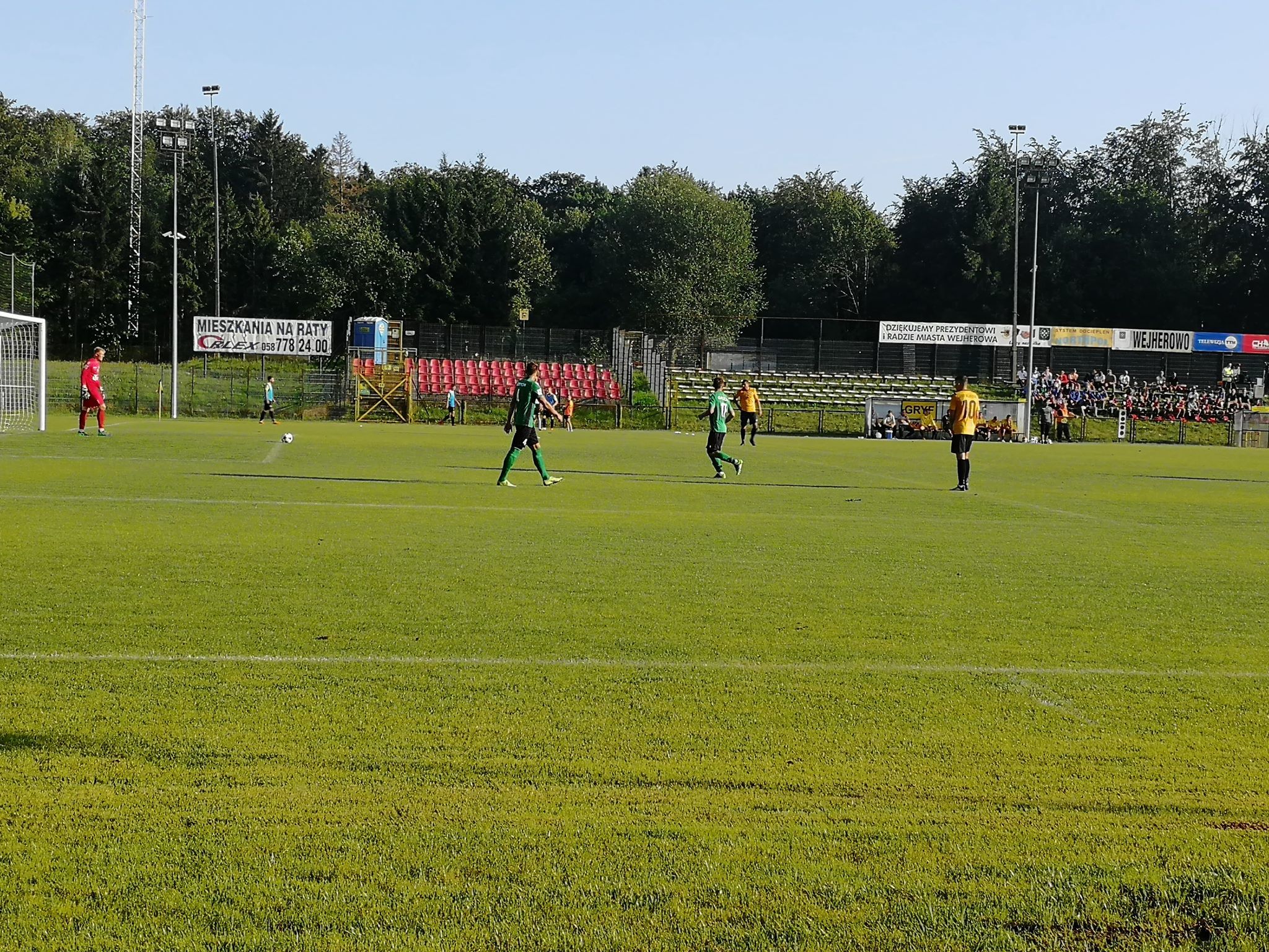 Pierwsza bramka padła pod koniec pierwszej połowy, a dokładnie w 45. minucie. Arkadiusz Jędrych wykorzystał podanie w pole karne i skierował futbolówkę tuż obok rękawicy bramkarza z Wejherowa umieszczając ją w siatce.
