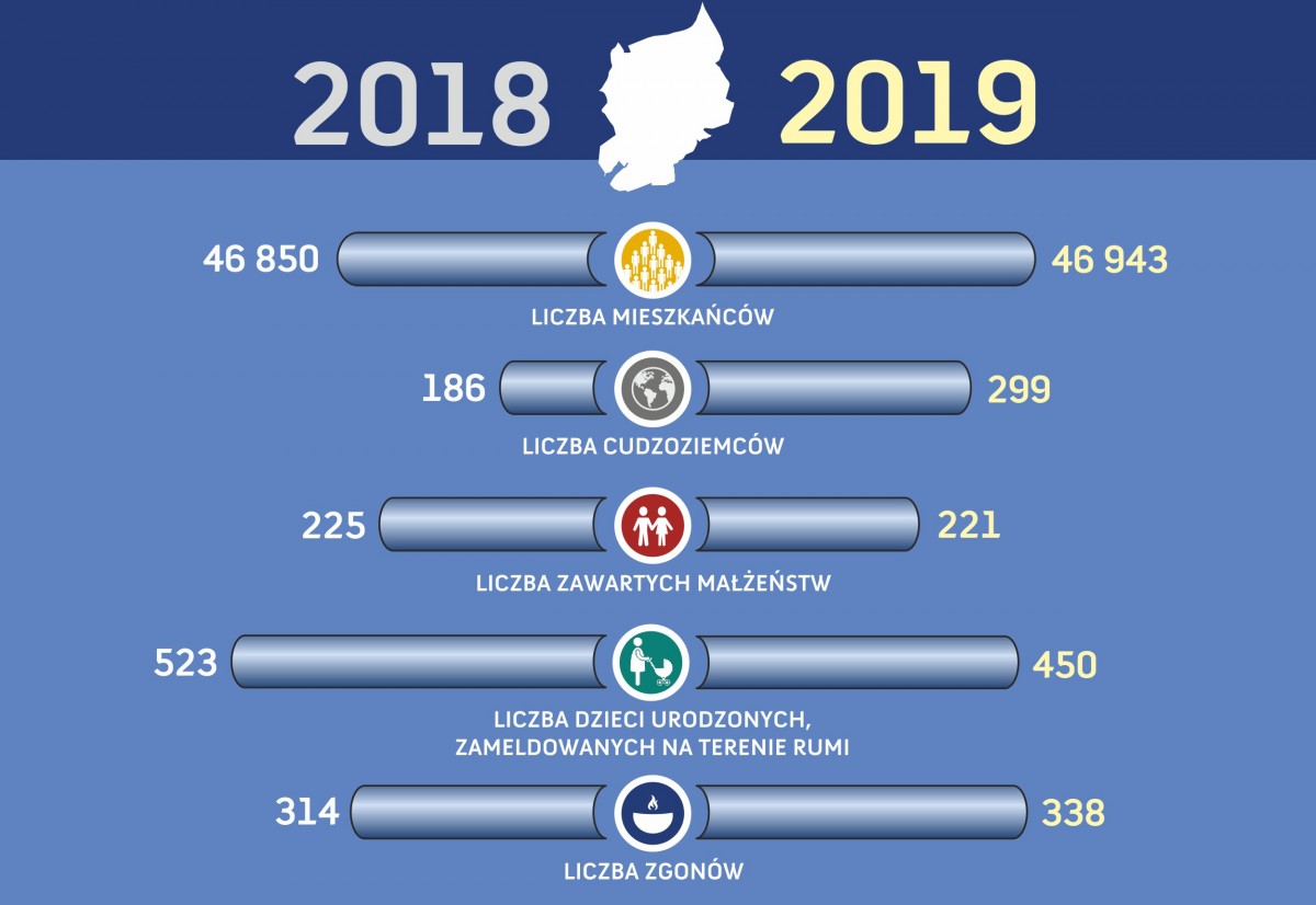 Jak wynika z opracowania rumskiego magistratu, pod koniec 2018 liczba osób zameldowanych w Rumi na pobyt stały i czasowy wynosiła łącznie 46 850 mieszkańców. Obecnie, a więc na przełomie 2019 i 2020 roku miasto zamieszkują 46 943 osoby, z czego niemal 52 procent stanowią kobiety.