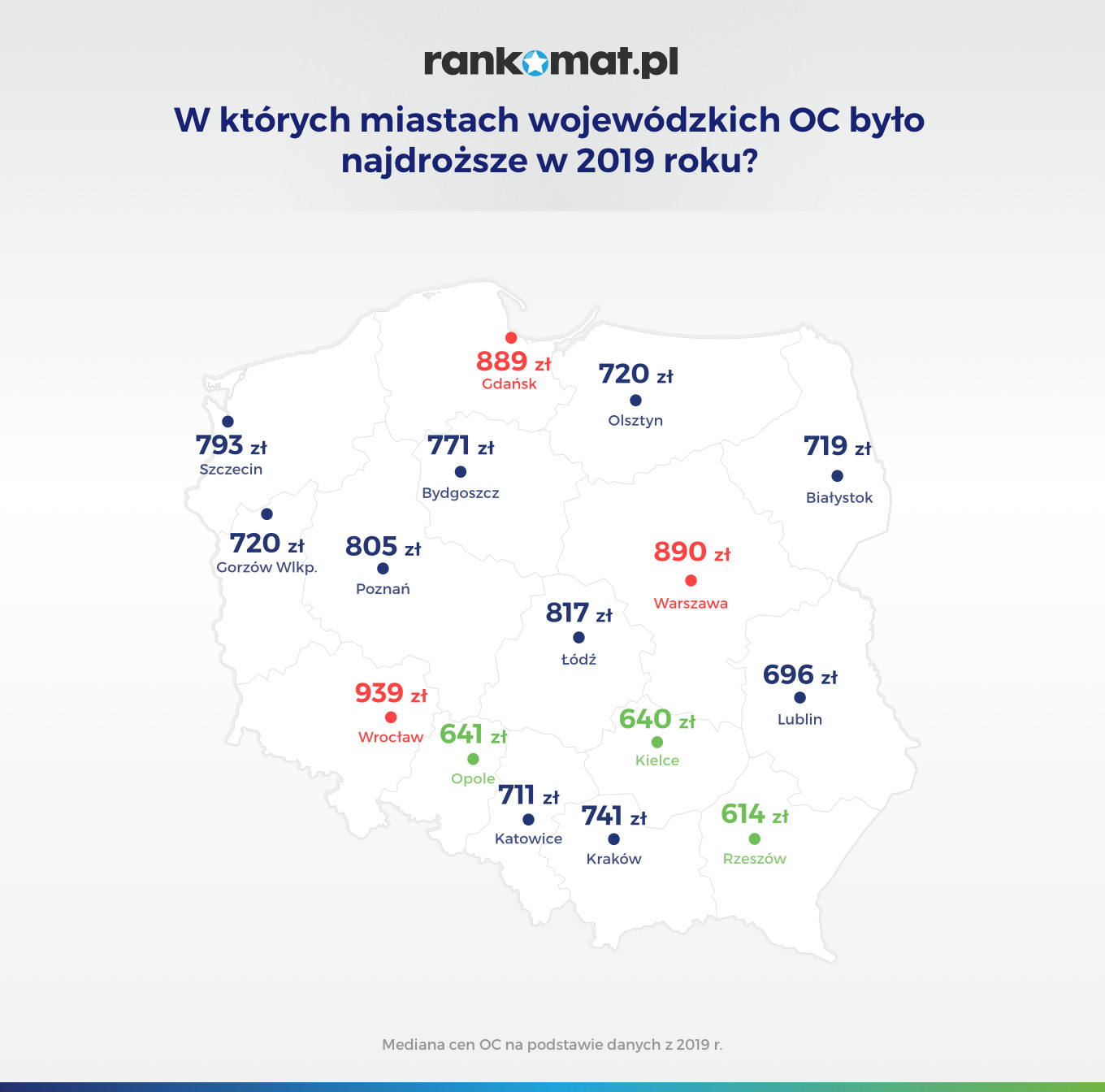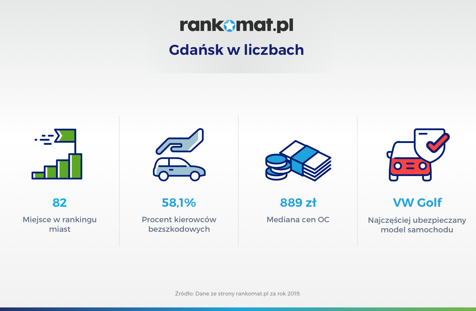 Okazuje się, że w Gdańsku jest jedno z najdroższych OC w kraju. Kierowcy z tego miasta w 2019 r. zapłacili średnio 889 zł. Więcej płacili tylko kierujący z Warszawy (890 zł) i Wrocławia (939 zł). Województwo pomorskie okazało się też najdroższym w całej Polsce – średnia cena polisy wyniosła 779 zł. Dla porównania, w województwie mazowieckim było to 768 zł, a w dolnośląskim, które znalazło się na 3. miejscu, 756 zł. Najmniej za OC płacili zmotoryzowani mieszkańcy Stalowej Woli (557 zł), Ostrowca Świętokrzyskiego (552 zł) i Mielca (515 zł).