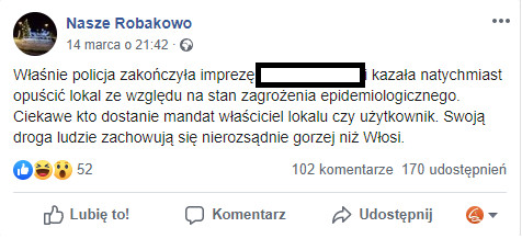 Policyjny finał miała jedna z imprez zorganizowanych w Robakowie, w niedzielę wieczorem (15 marca). Swoje działania mundurowi tłumaczyli decyzją ministra zdrowia o wprowadzeniu stanu zagrożenia epidemicznego.