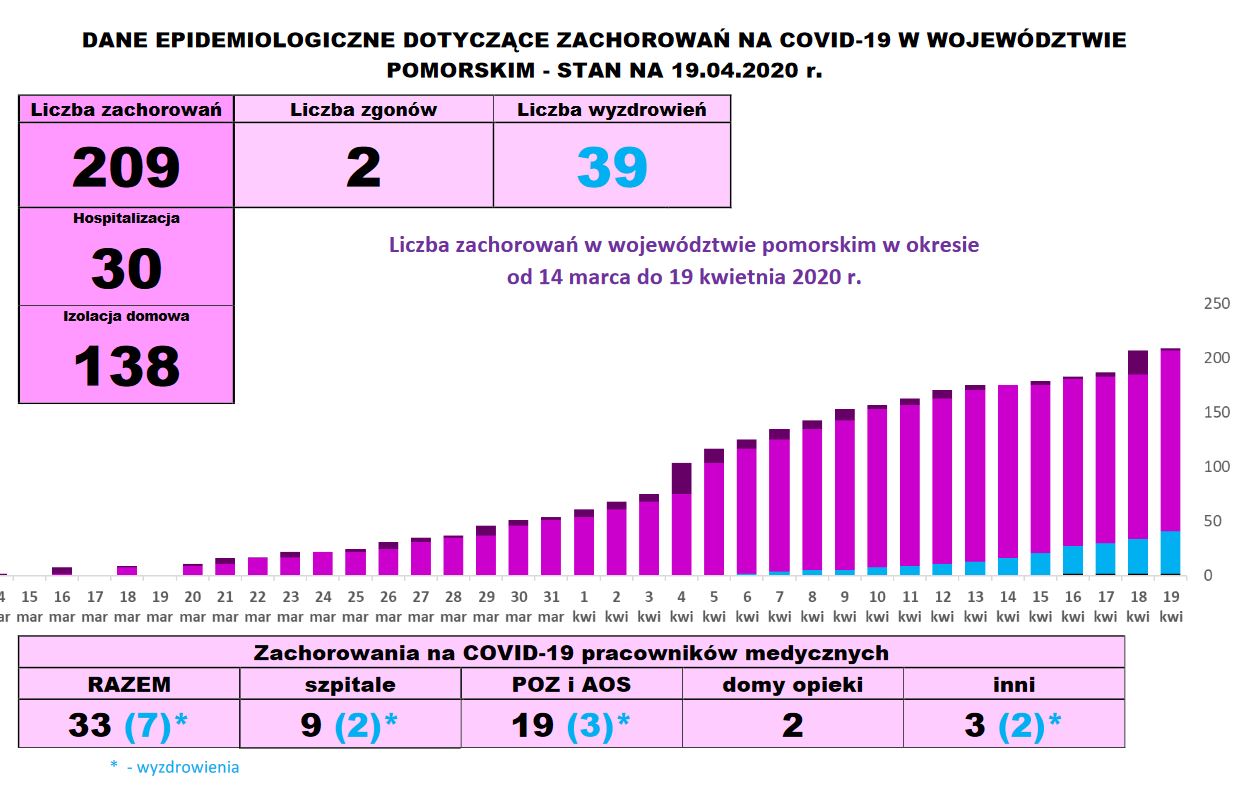 Niestety, dane, które przedstawiono w niedzielę (19 kwietnia), nie były zbyt optymistyczne. Odnotowano najwyższą dotąd liczbę nowych przypadków COVID-19 w Polsce, która wynosiła 545 osób. Po złych danych z soboty (18 kwietnia), w niedzielę podano znacznie lepsze wskaźniki w odniesieniu do Pomorza. Stwierdzono zaledwie dwa zakażenia koronawirusem, w tym jedno u osoby z powiatu puckiego.