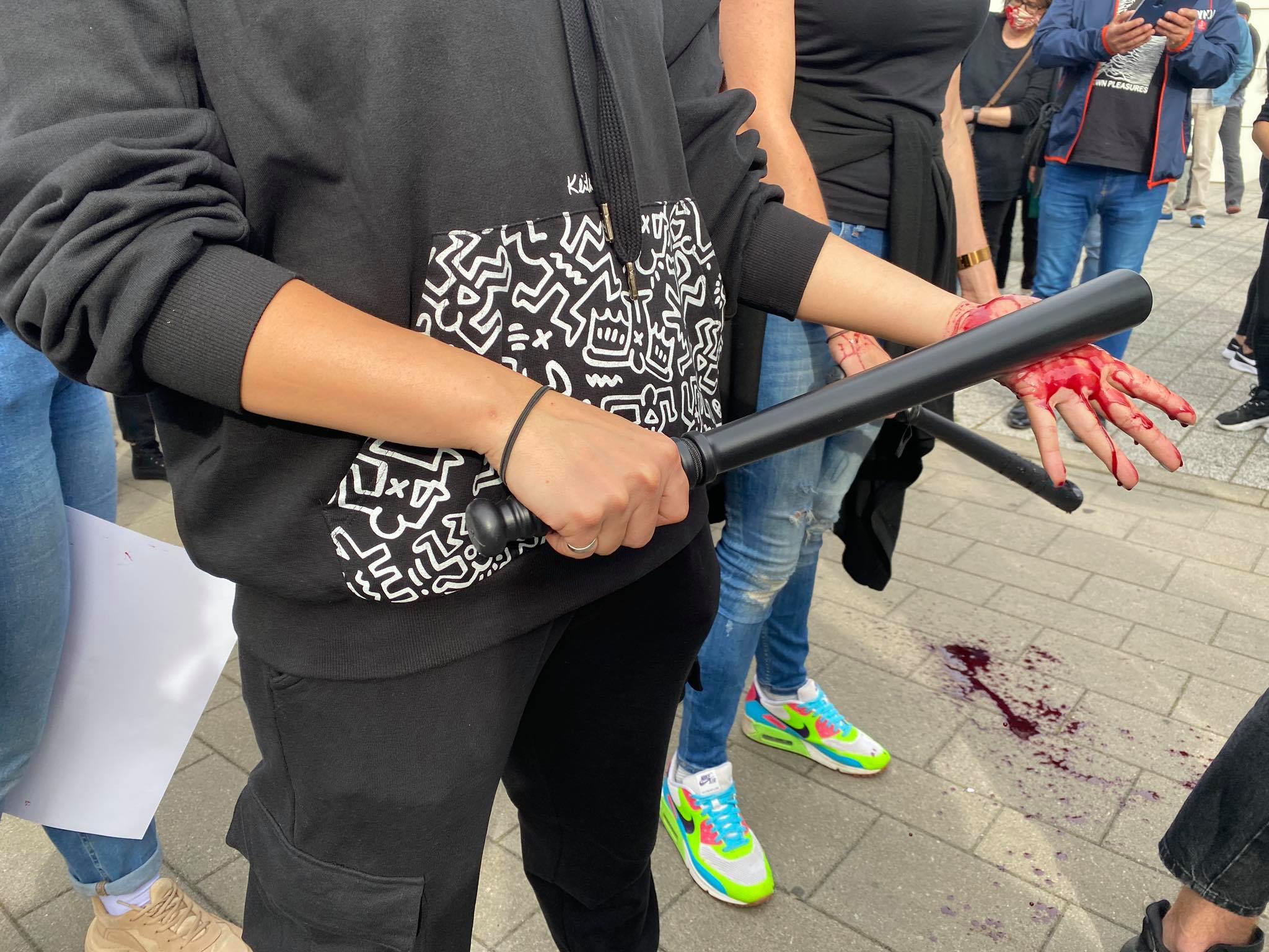 Zebrani w większości ubrani byli na czarno, a ich ręce oblane były czerwoną farbą. W rękach trzymali zaś czarne milicyjne pałki wyprodukowane przez Yahora Kondratsiuk, którymi „pałowali” przeciwników rządów białoruskiego przywódcy, który mimo przegranych wyborów, nie chce odejść.
