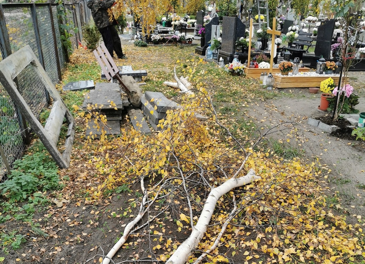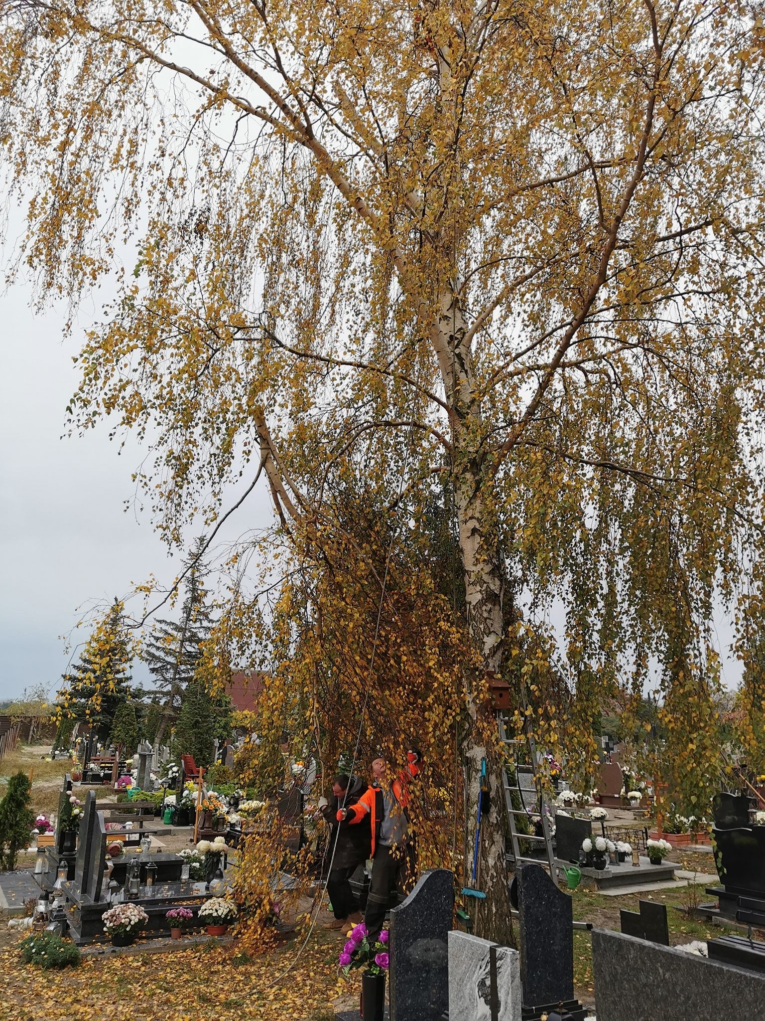 Oprócz usunięcia dziewięciu sosen prace polegają także na pielęgnacji i obniżeniu brzóz rosnących na terenie cmentarza.