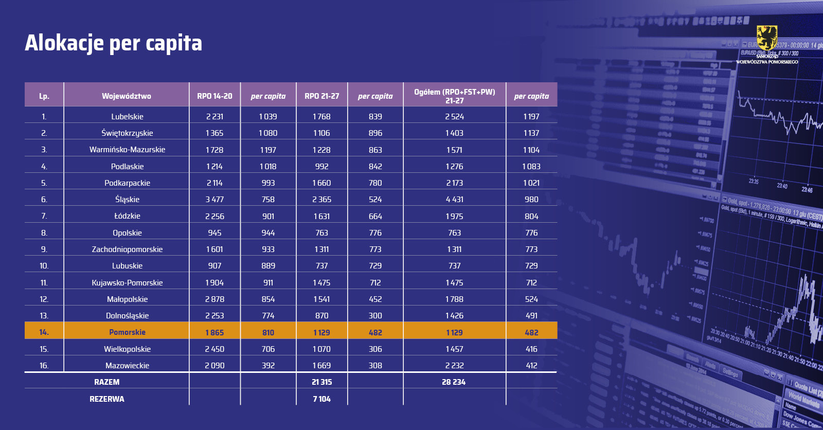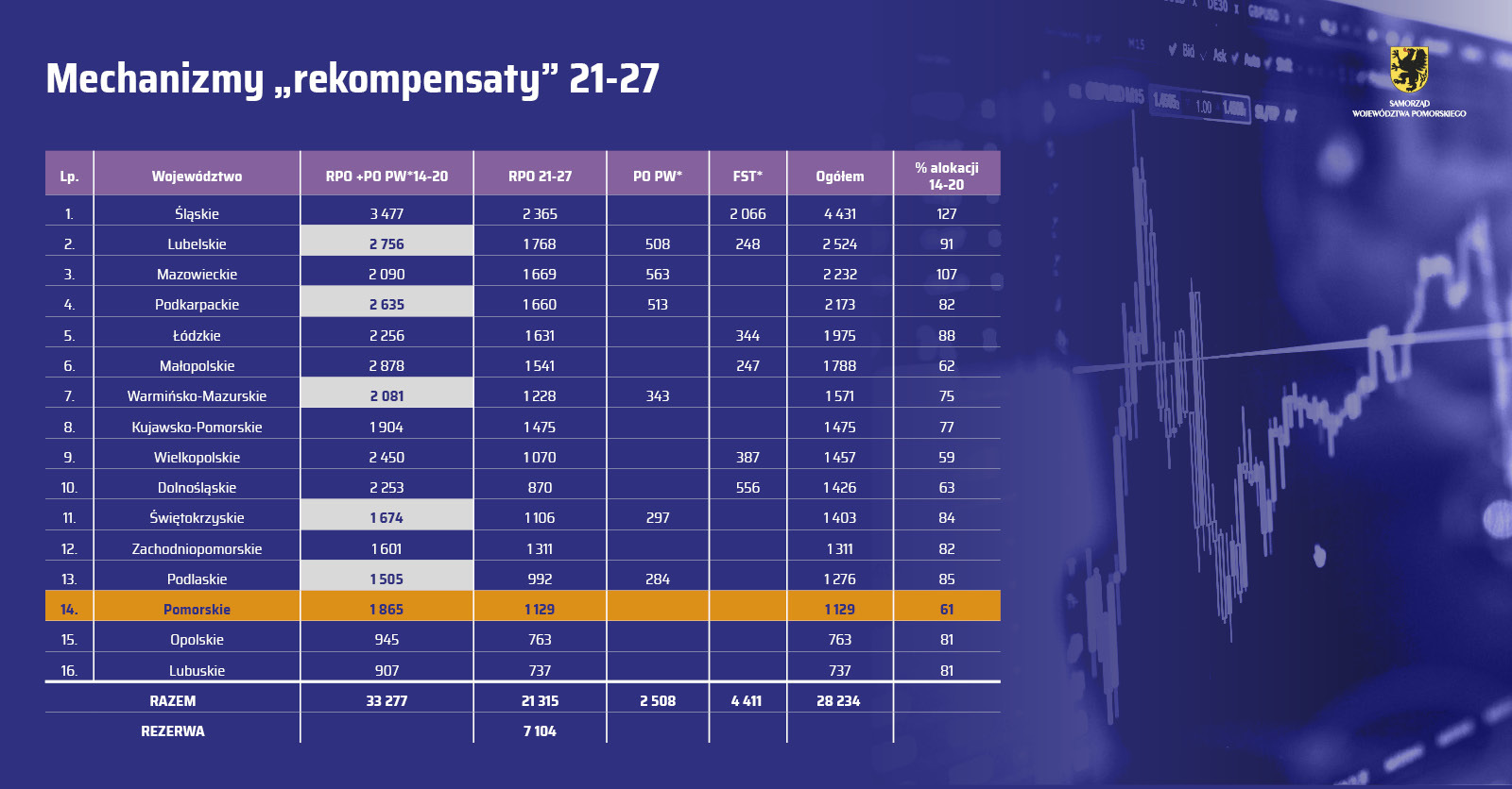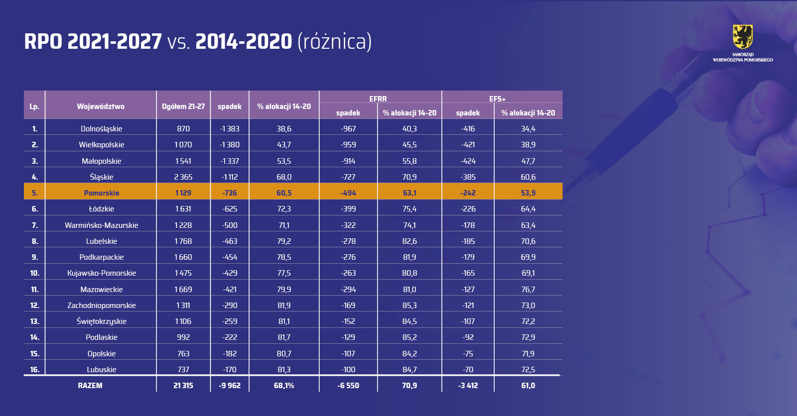 Województwo pomorskie nie może liczyć też na żadne mechanizmy rekompensujące spadek kwoty na program regionalny. Nie obejmuje nas ani wsparcie Programu Polska Wschodnia, ani Fundusz Sprawiedliwej Transformacji. W przeliczeniu na mieszkańca otrzymamy 482 euro, podczas gdy w latach 2014-2020 kwota ta wynosiła 812 euro. Mniej od Pomorza otrzymają woj. Mazowieckie, w którym mieszkańcy mogą liczyć na 412 euro i woj. Dolnośląskie z 416 euro.