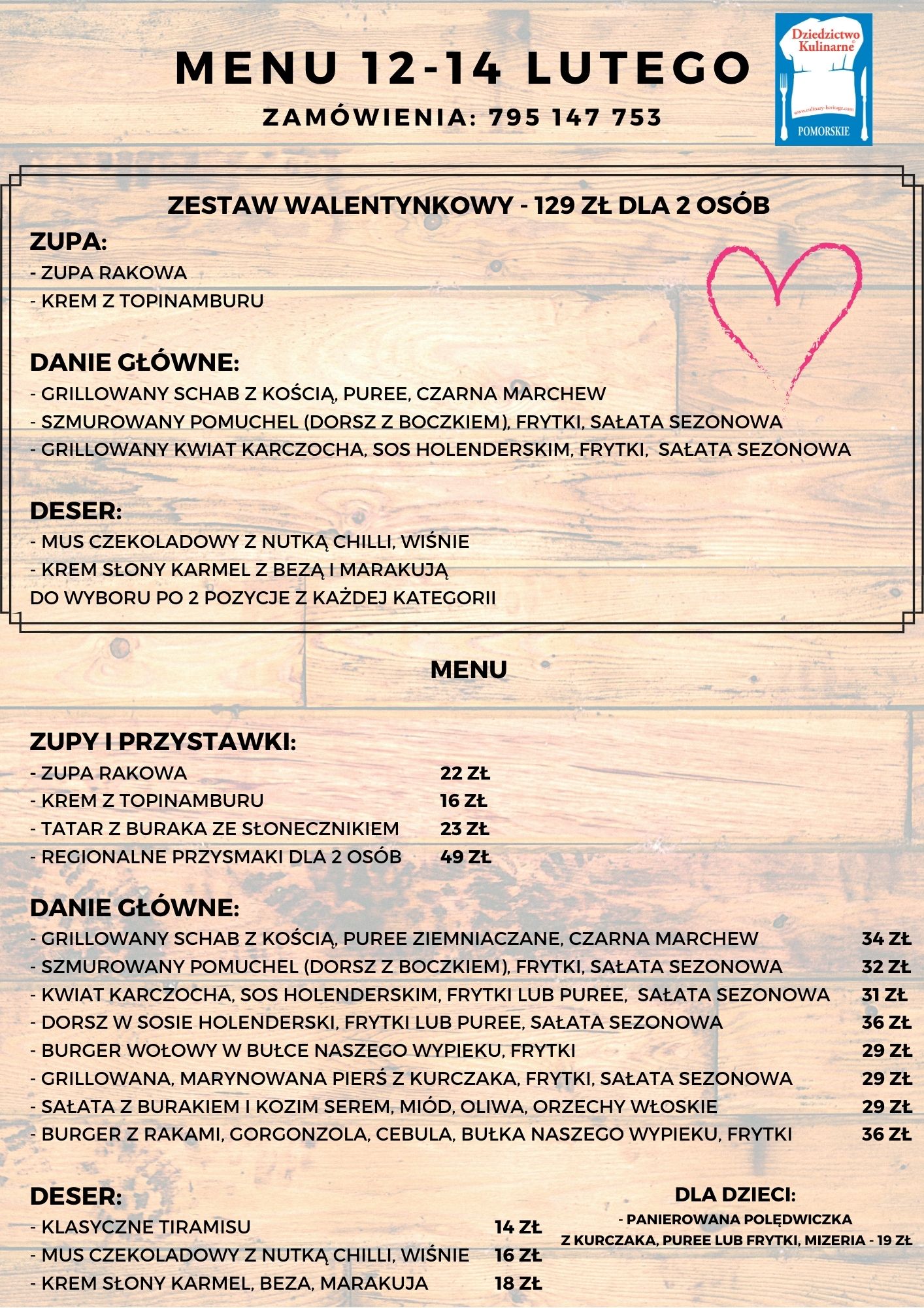 Przygotowaliśmy specjalne menu, pełne afrodyzjaków. Zgodnie z naszą filozofią przygotowujemy wszystko z naturalnych składników, bez konserwantów czy ulepszaczy. Na przystawkę proponujemy zupę z raków lub krem z topinamburu, jako danie główne do wyboru jest marynowany i grillowany schab z kością, szmurowany pomuchel (dorsz z boczkiem) lub grillowany kwiat karczocha w sosie holenderskim. Jako dopełnienie całości do wyboru jest deser - mus czekoladowy z chilli i wiśniami lub krem słony karmel z bezą i marakują. Koszt takiego zestawu to 129 zł dla 2 osób.