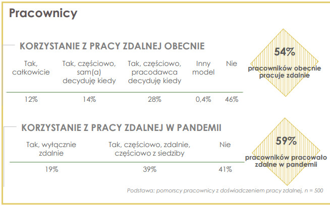 W marcu 2020 roku pracę zdalną rozpoczęło 11 proc. pracowników. Z końcem czerwca odsetek ten zmniejszył się do 10,2 proc., a na koniec III kwartału 2020 roku wyniósł 5,8 proc. Na Pomorzu praca poza firmą możliwa jest w 67 proc., lecz nie dla wszystkich ich pracowników.