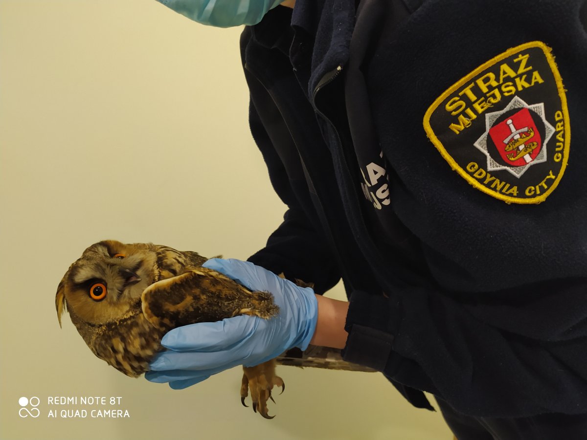 Niebezpieczne spotkanie, najprawdopodobniej z szybą, przeżyła sowa uszata. Gdyński EkoPatrol interweniował przy ul. 10 Lutego, po tym jak otrzymał zgłoszenie o rannym ptaku leżącym na chodniku.