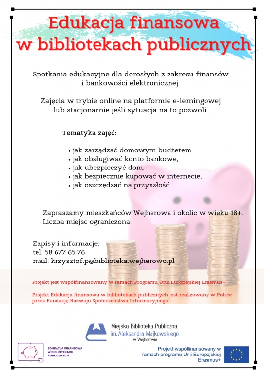 – Jeżeli chcesz dowiedzieć się jak planować domowy budżet, jak korzystać z internetowego konta bankowego, jak ubezpieczyć siebie, swoich bliskich i dom oraz jak bezpiecznie kupować online oraz dowiedzieć się wiele innych ciekawych rzeczy o sprawach finansowych, zapraszamy do zapisania się na kurs "Edukacja finansowa w bibliotekach publicznych" – czytamy na stronie wejherowskiego urzędu.