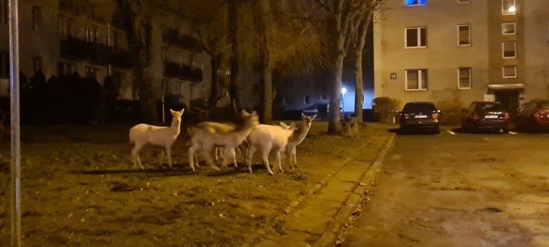 Mieszkaniec Wejherowa zgłosił strażnikom miejskim, że na parkingu przy supermarkecie chodzi stado jeleni. Patrol zauważył dzikie zwierzęta przy bloku nr 11. Sarna albinos i pięć białych danieli chodziło po osiedlu, ale szybko ruszyły w stronę lasu.