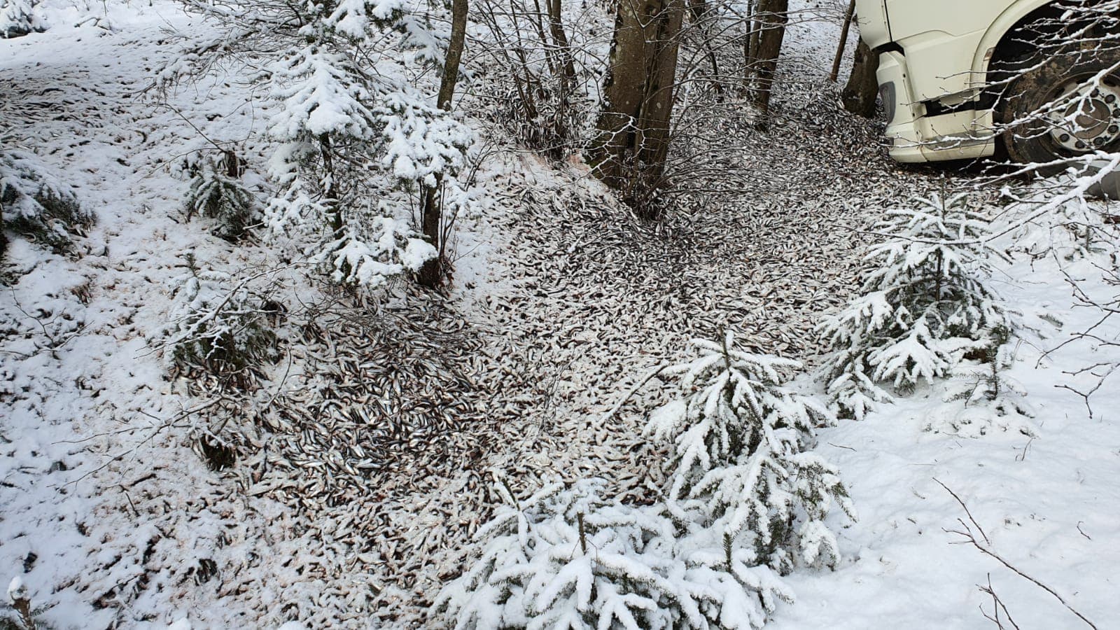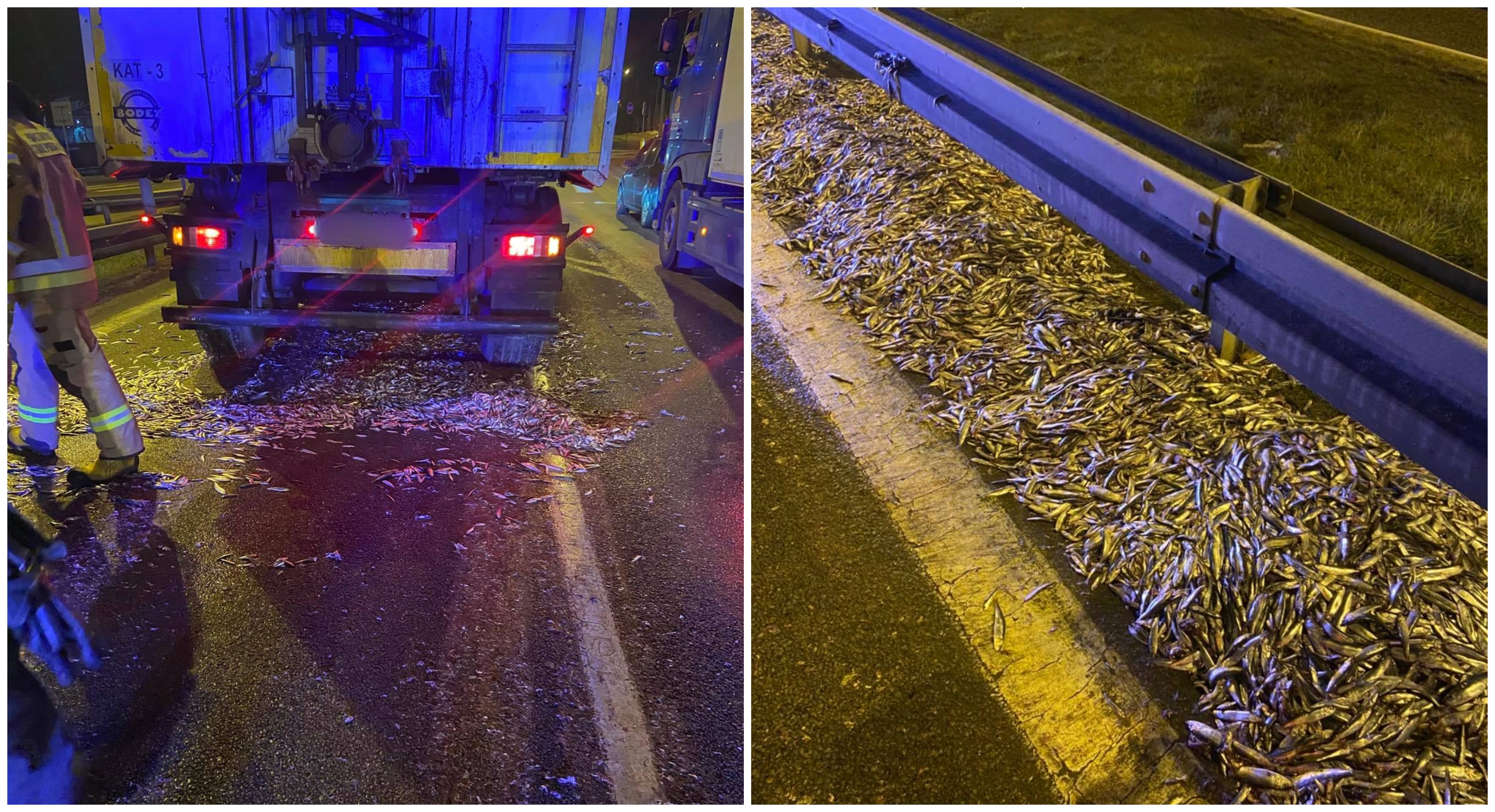 W Wejherowie w poniedziałek (22 lutego) na drodze krajowej nr 6 z tira wysypały się 2 tony ryb. Na miejscu pracowały służby, które usuwały je z drogi.
