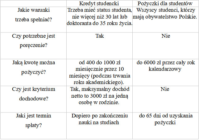 Inną formą utrzymania się podczas nauki na uczelniach wyższych są kredyty oraz pożyczki studenckie - są one udzielane często na bardzo korzystnych warunkach z możliwością spłaty dopiero po zakończeniu nauki. Wszyscy wiemy, że studenckie lata są czasami bardzo skromne, dlatego też pożyczka dla studenta to czasami jedyna możliwość na otrzymanie dodatkowego zastrzyku gotówki. Oprócz pożyczek studenckich z uczelni na rynku jest coraz bogatsza oferta pożyczek pozabankowych dedykowanych właśnie dla uczniów uczelni wyższej. Firmy takie podchodzą mniej rygorystycznie do badania zdolności kredytowej i chętniej udzielają pomocy finansowej niż banki i uczelnie. Przekonajcie się sami: