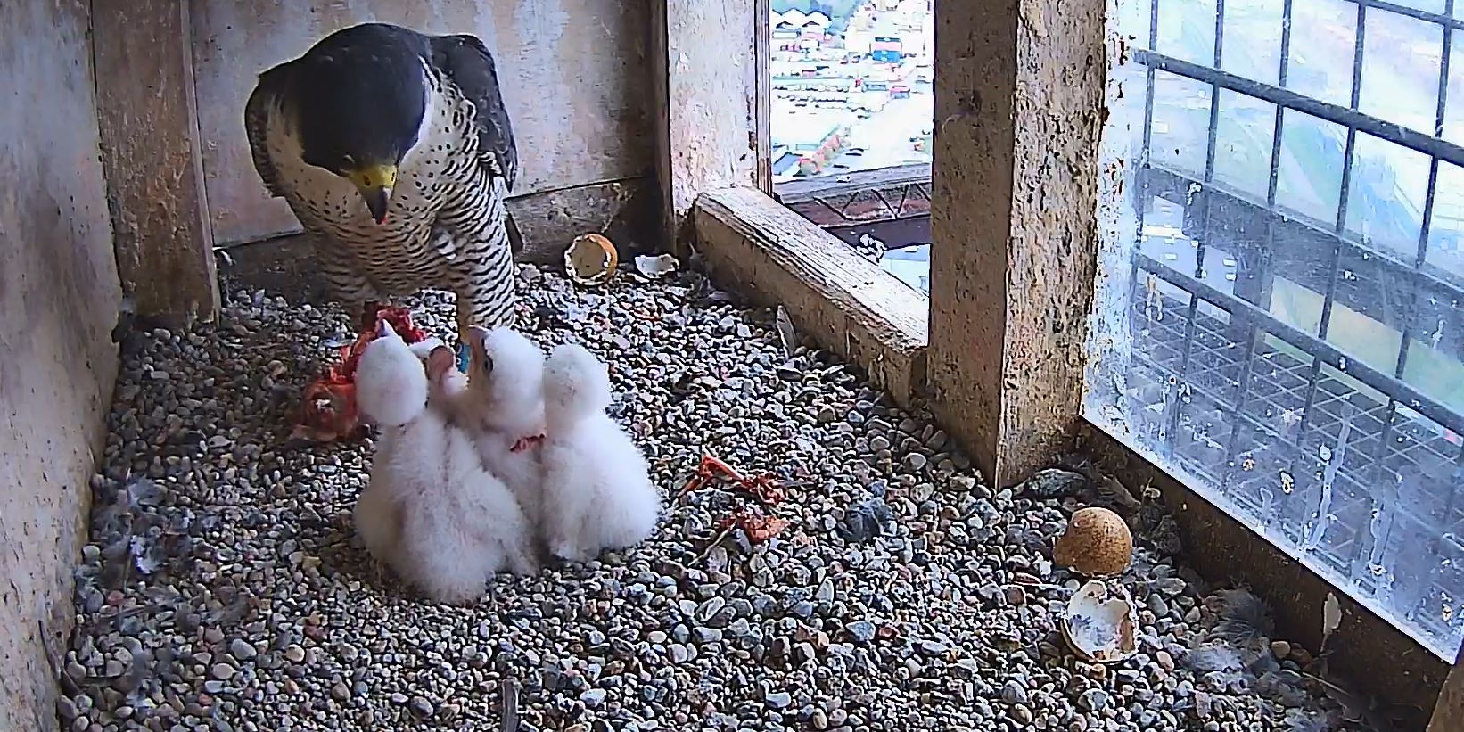 Wielkie narodziny w gnieździe sokołów gniazdujących na kominie elektrociepłowni w Gdyni! Bosman i Koksinka doczekali się czterech potomków.