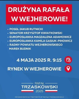 W sobotę, 4 maja 2025 roku w Wejherowie odbędzie się kolejne spotkanie w ramach kampanii prezydenckiej Rafała Trzaskowskiego. Do miasta przyjedzie jego silna reprezentacja – „Drużyna Rafała”, czyli politycy Koalicji Obywatelskiej, którzy wspierają swojego kandydata w walce o prezydenturę.
