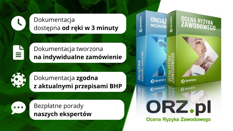 ORZ.pl to internetowa baza dokumentacji oceny ryzyka zawodowego, która pozwala na szybkie i efektywne przygotowanie wymaganych materiałów zgodnie z obowiązującym prawem. Dzięki platformie możliwe jest kupienie i pobranie gotowych dokumentów w formacie Word (.docx), które można natychmiast edytować i dopasować do specyfiki własnego zakładu pracy.