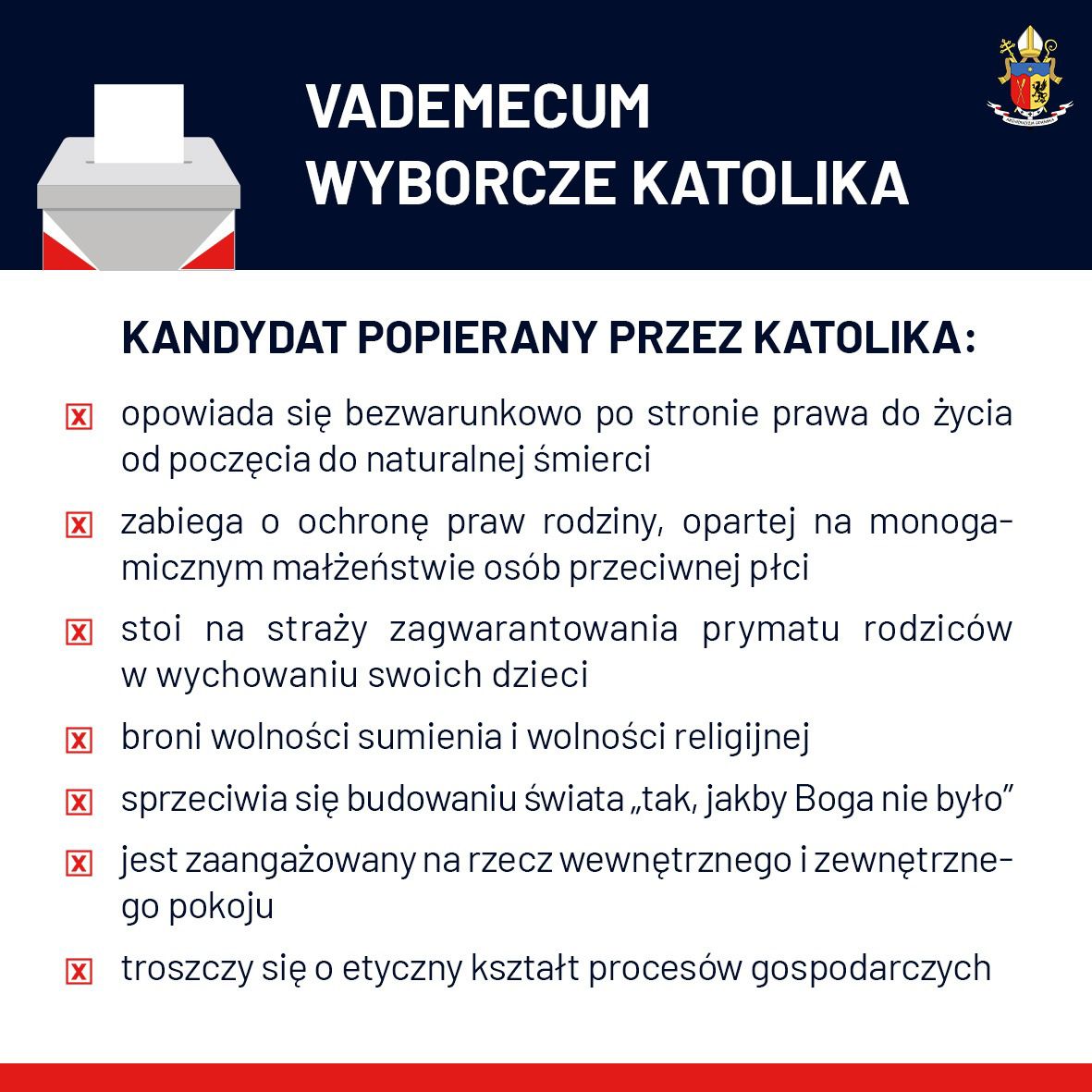 — Kandydat popierany przez katolika opowiada się bezwarunkowo po stronie prawa do życia – od poczęcia do naturalnej śmierci, zabiega o ochronę praw rodziny, opartej na monogamicznym małżeństwie osób przeciwnej płci, oraz stoi na straży zagwarantowania prymatu rodziców w wychowaniu swoich dzieci – czytamy w vademecum.