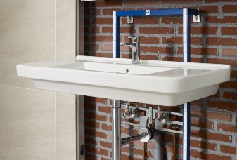 Stelaż pod umywalkę ułatwia też organizację instalacji – zarówno odpływu, jak i rur zasilających. Wszystkie przewody ukryte są w ścianie, nie psując estetyki pomieszczenia i nie zbierając kurzu. To duża zaleta także pod kątem utrzymania czystości – brak wystających elementów to mniej miejsc, które trzeba czyścić z trudnych osadów i zanieczyszczeń.