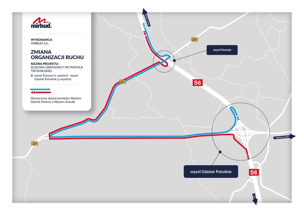 Już za kilka dni kierowców czekają utrudnienia. Otóż od 24 do 25 maja (od soboty godz. 18:00 do niedzieli godz. 18:00) zamknięty zostanie fragment Obwodnicy Trójmiasta (S6) między węzłami Kowale i Gdańsk Południe. Powodem są prace rozbiórkowe obiektu w ciągu ul. Sadowej i Podgórnej. Ruch zostanie skierowany objazdem przez fragment OMT i DW221 z ręcznym kierowaniem ruchu na rondach węzła Kowale.