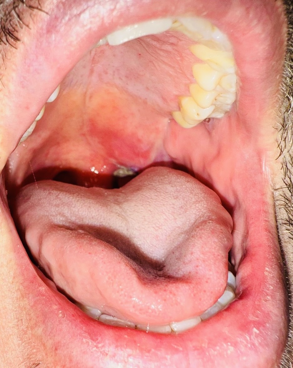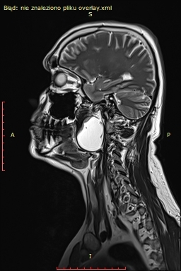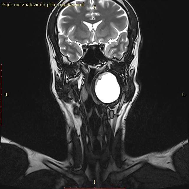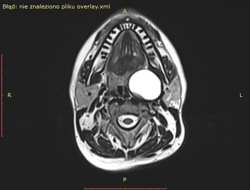 Badanie rezonansu magnetycznego wykazało (widoczne na zdjęciu) u pacjenta obecność dużej zmiany torbielowatej w przestrzeni przygardłowej po stronie lewej o wymiarach 54x42x38 mm. Zmiana miała postać torbieli zawierającej jednolity płyn, z pogrubiałą, postrzępioną wewnętrzną ścianą i gładką powierzchnią zewnętrzną. Torbiel powodowała przemieszczenie i ucisk okolicznych struktur. Biopsja aspiracyjna cienkoigłowa sugerowała torbiel boczną szyi.