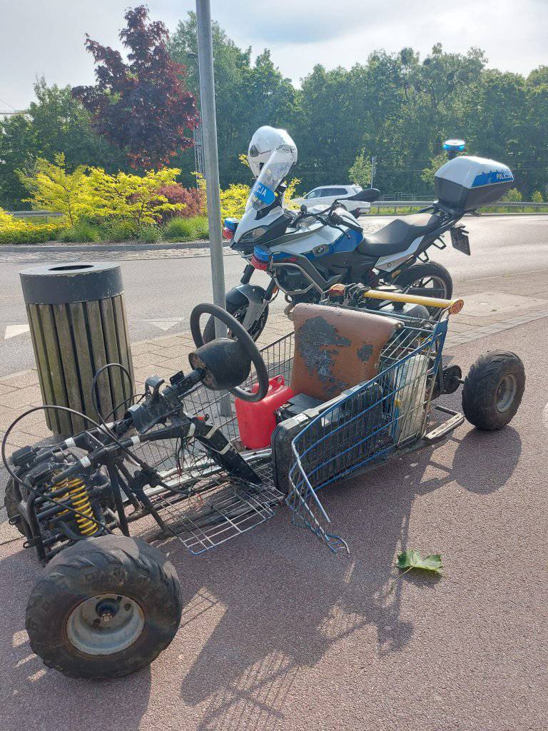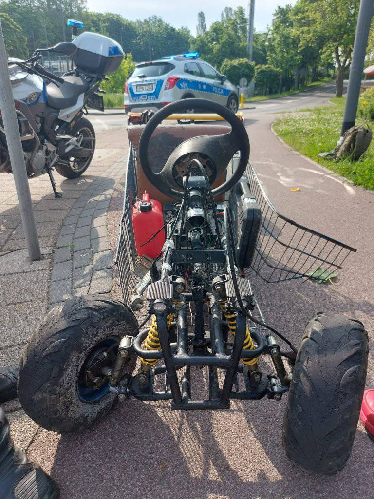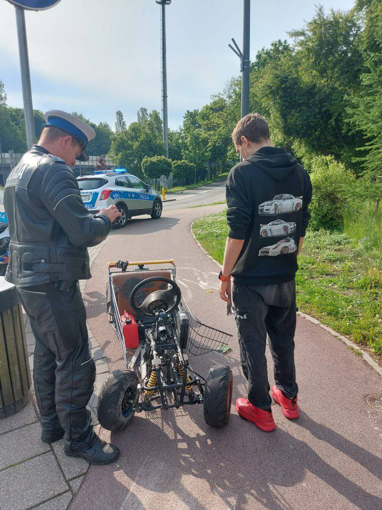 Niecodzienna interwencja policji drogowej w Sopocie. Funkcjonariusze zatrzymali 19-letniego mieszkańca Gdańska, który poruszał się po chodniku i ścieżce rowerowej samodzielnie zbudowanym pojazdem — złożonym z… wózka sklepowego i silnika o pojemności 50 cm sześc.