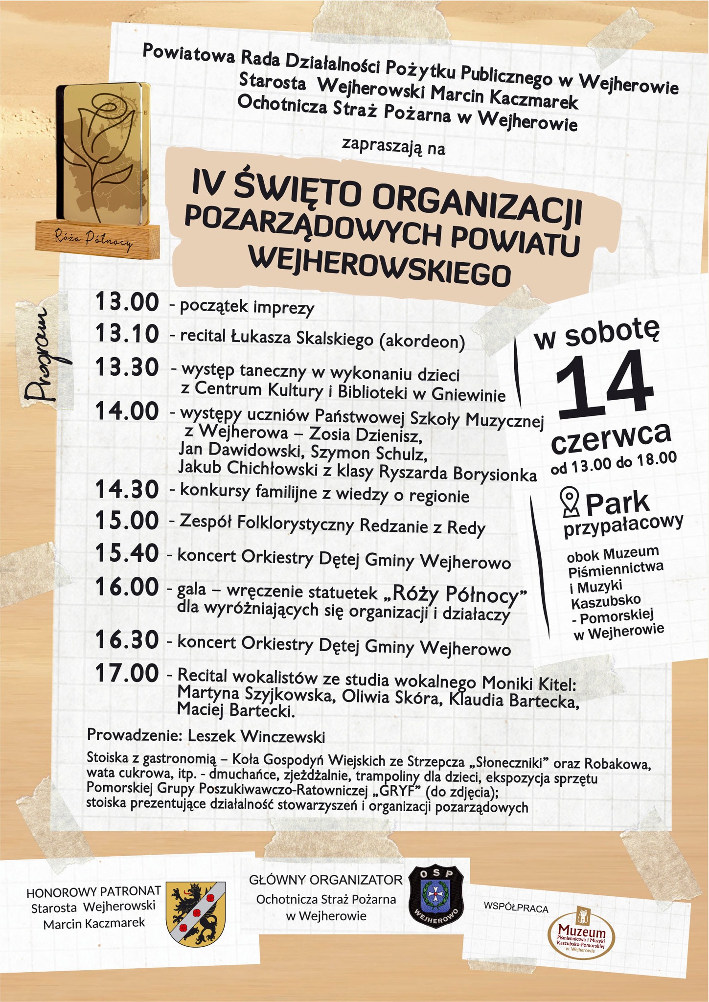 Powiatowa Rada Działalności Pożytku Publicznego, Starosta Wejherowski Marcin Kaczmarek oraz Ochotnicza Straż Pożarna w Wejherowie zapraszają na IV Święto Organizacji Pozarządowych Powiatu Wejherowskiego. To wyjątkowa okazja, by poznać działalność lokalnych stowarzyszeń, wziąć udział w rodzinnych konkursach, posłuchać muzyki i skosztować lokalnych przysmaków. W programie m.in.: