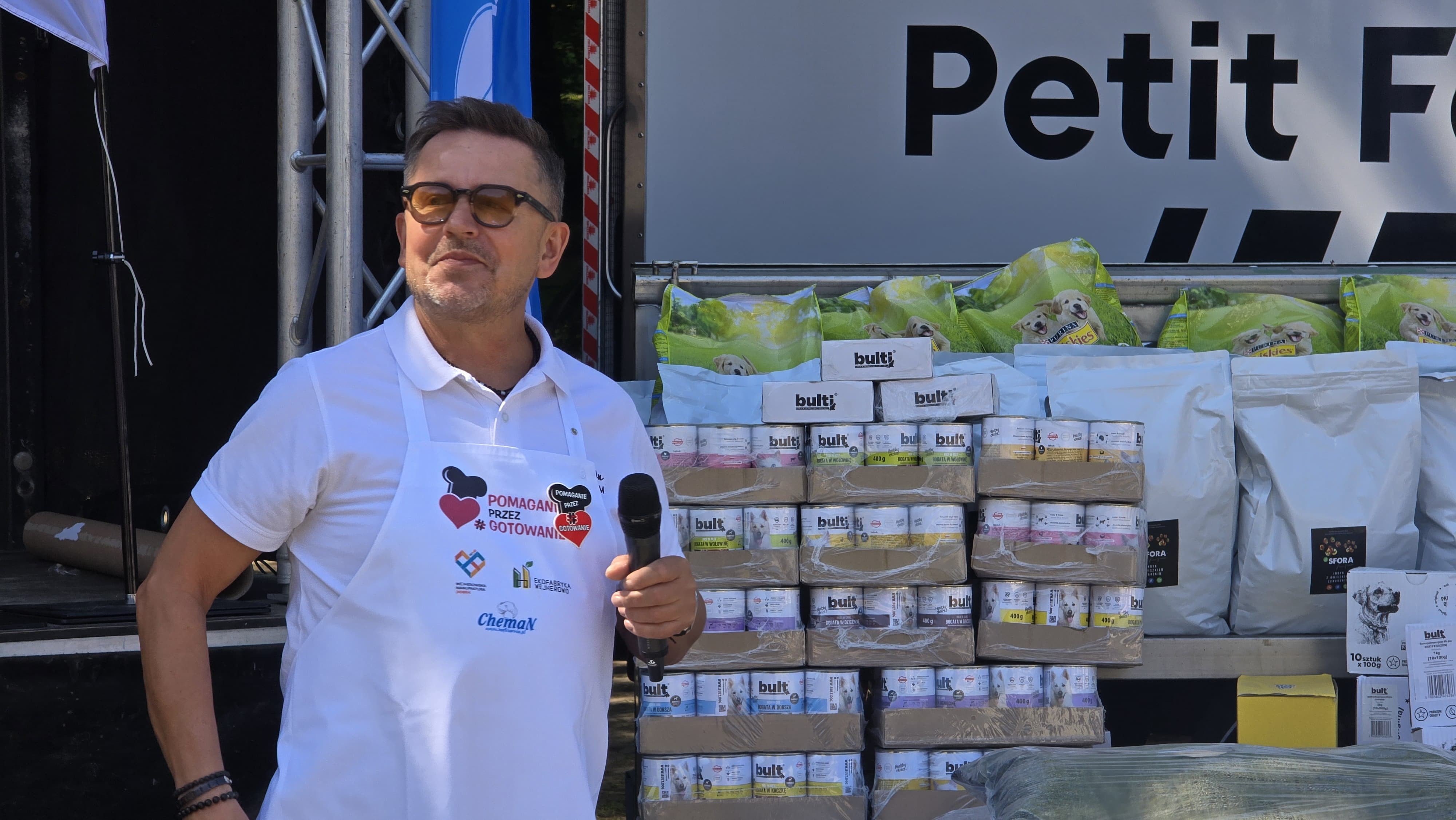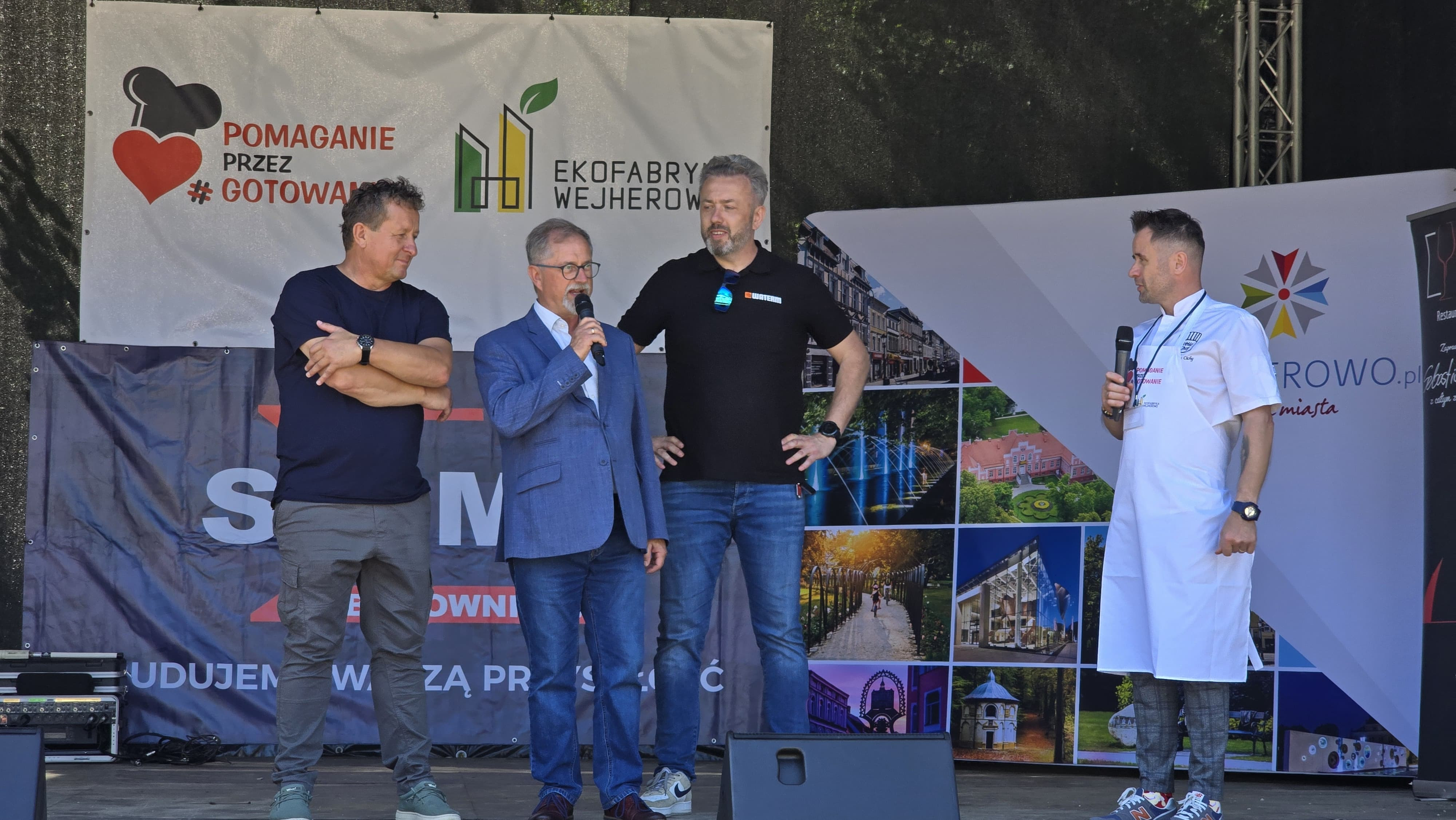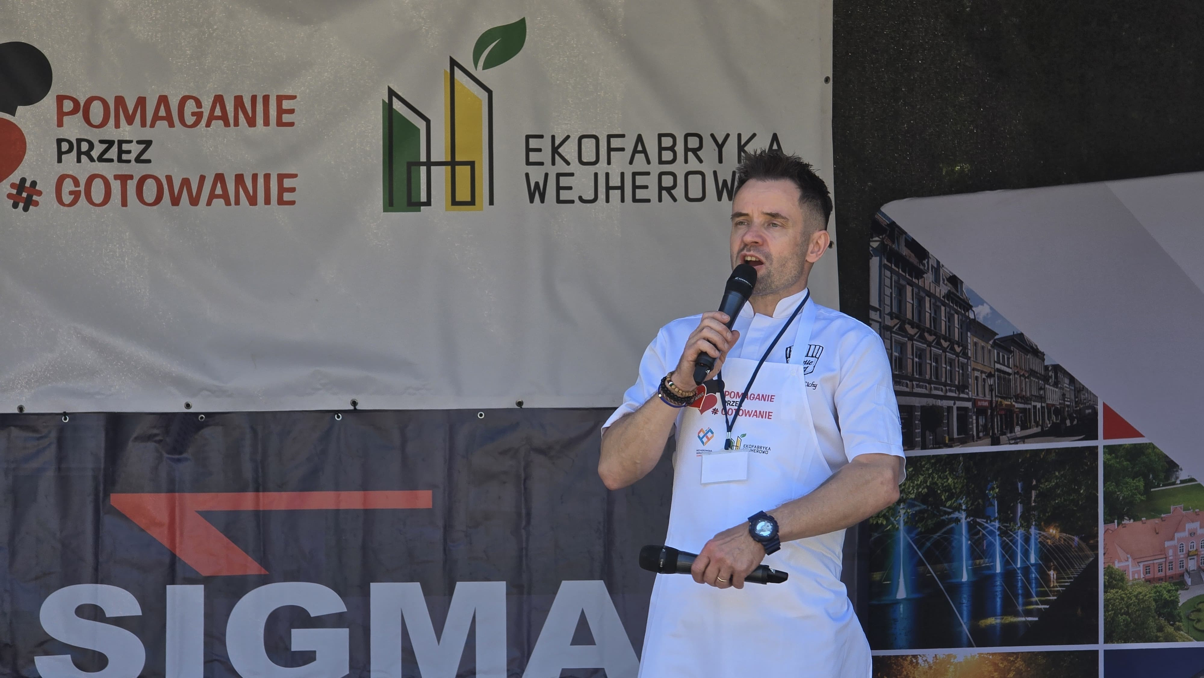 — Wielkie święto, spotykamy się w parku, żeby pomagać dzięki zaangażowaniu wielu osób między innymi Ekofabryki, nowej fundacji - Wejherowskiej Manufaktury Dobra, ale też dzięki panu Sebastianowi Cichy, który był pomysłodawcą wydarzenia "Pomaganie przez Gotowanie". Dzisiaj kucharze z całej Polski, znane postacie gotują dla mieszkańców Wejherowa i wszystkich, którzy tu przyjechali - wyjaśnia Arkadiusz Kraszkiewicz, zastępca prezydenta Wejherowa.